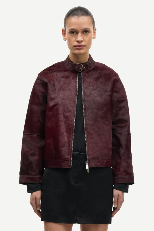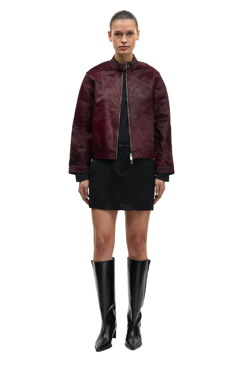 A twist on the regular cowhide jacket, one of the latest coats to emerge from Danish brand Samsøe Samsøe is this burgundy-coloured, belted, collared, boxy jacket. A piece that truly embodies the label's design aesthetic — simple yet striking.