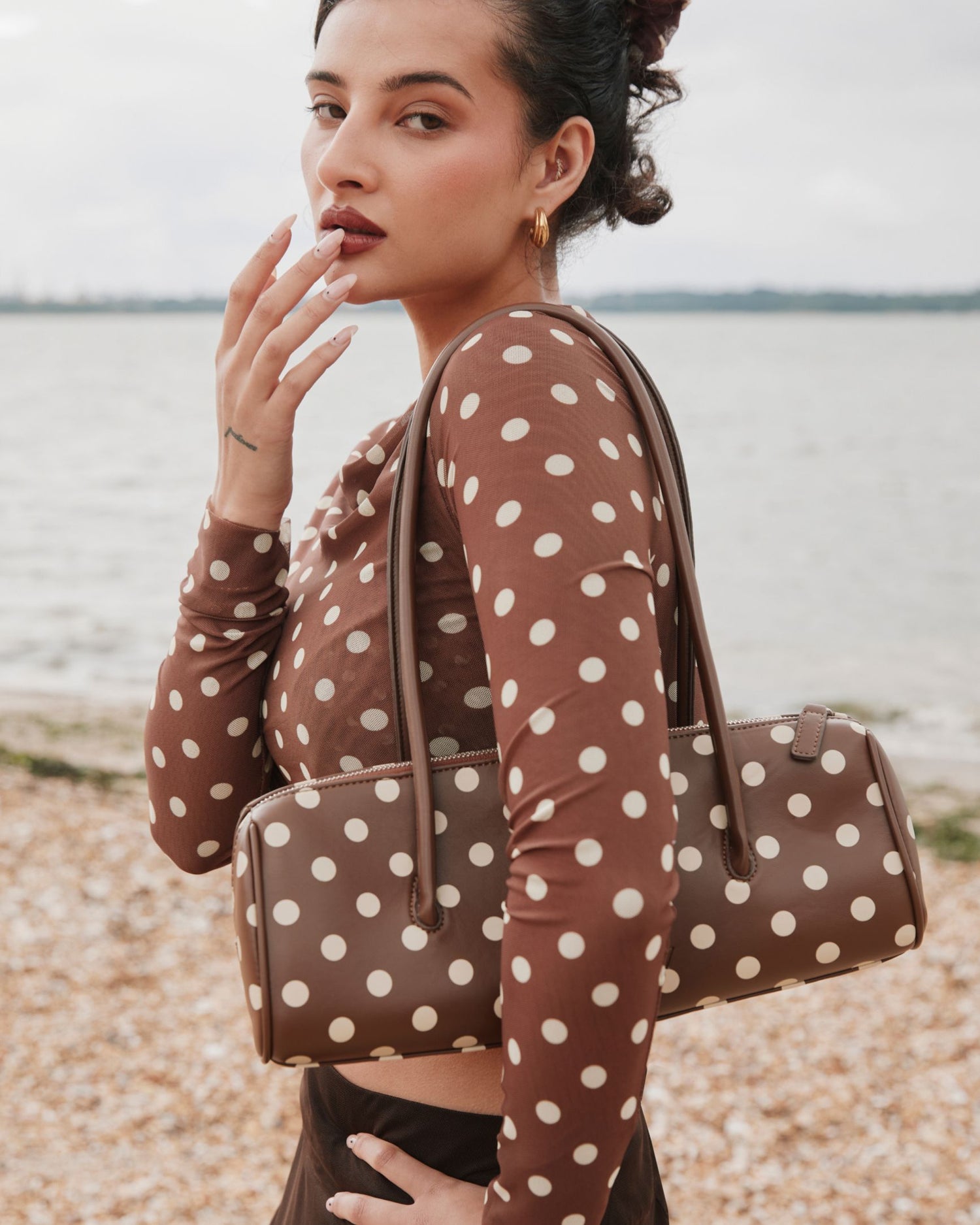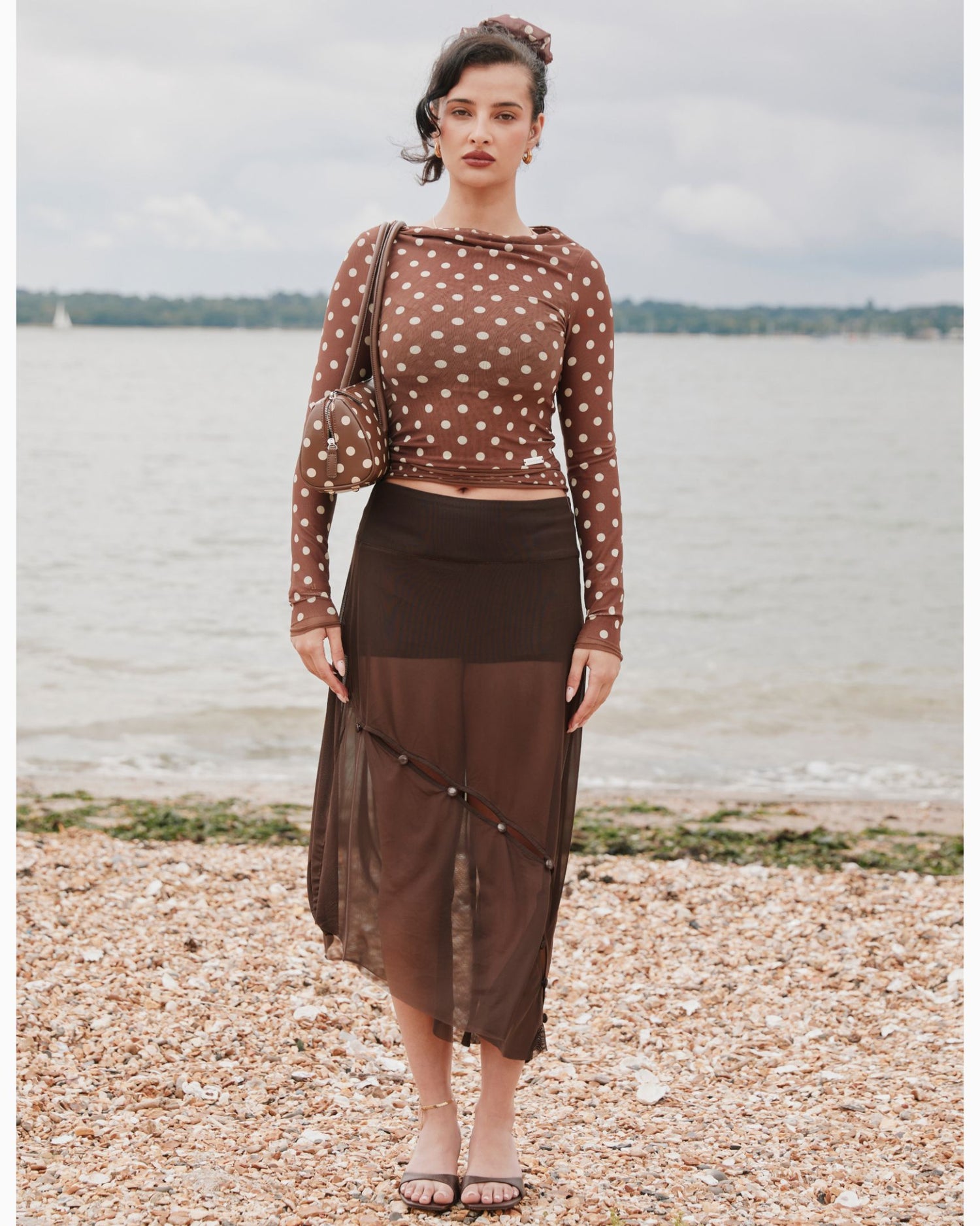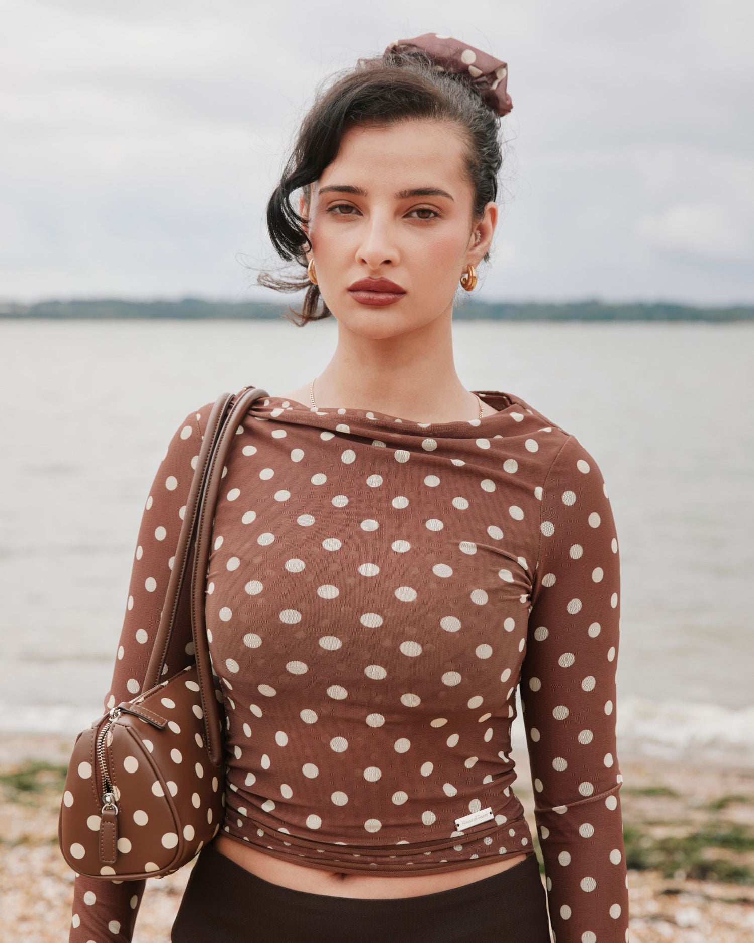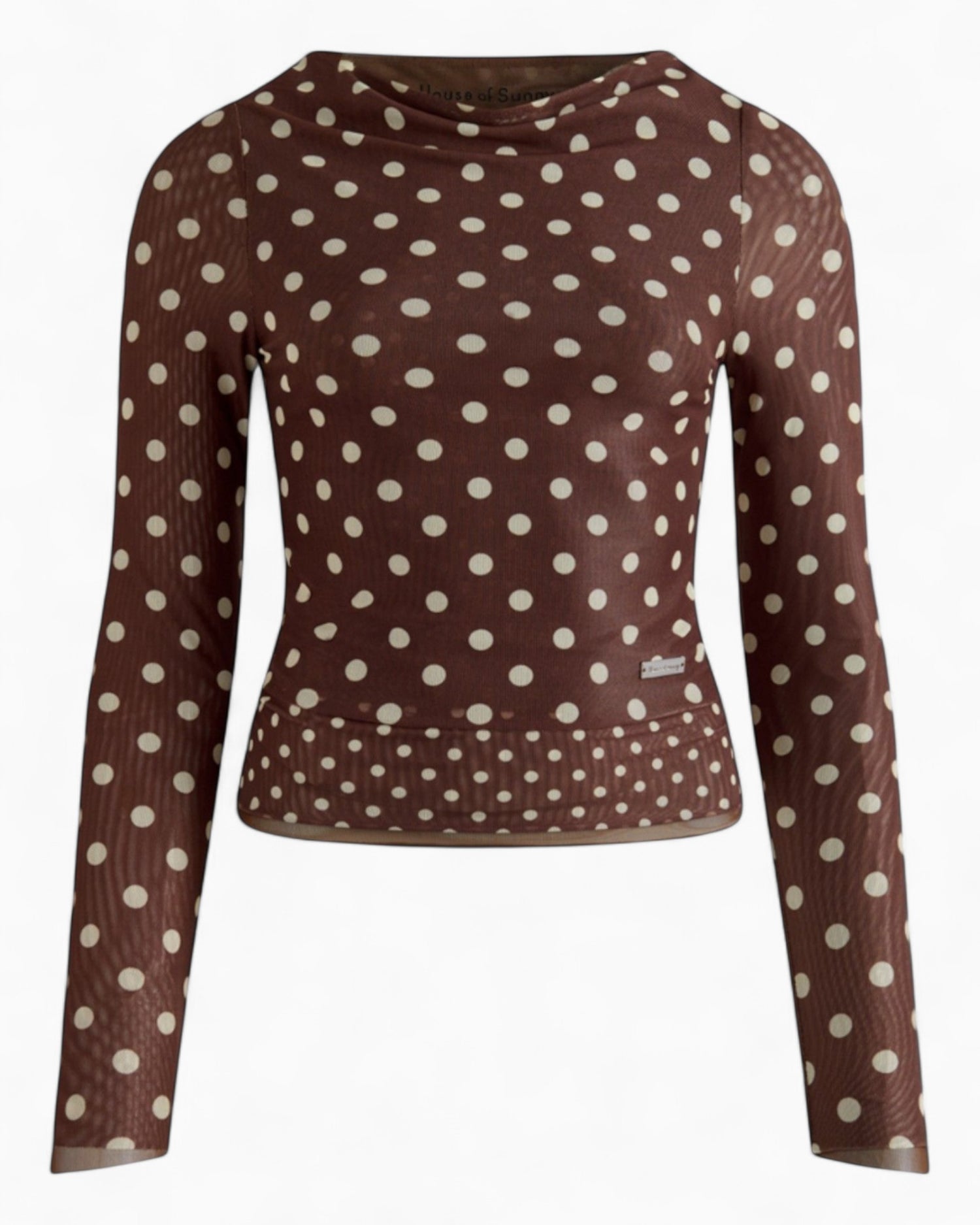 - Double-layer design with cowl neck, featuring exclusive printed polka dot mesh fabric