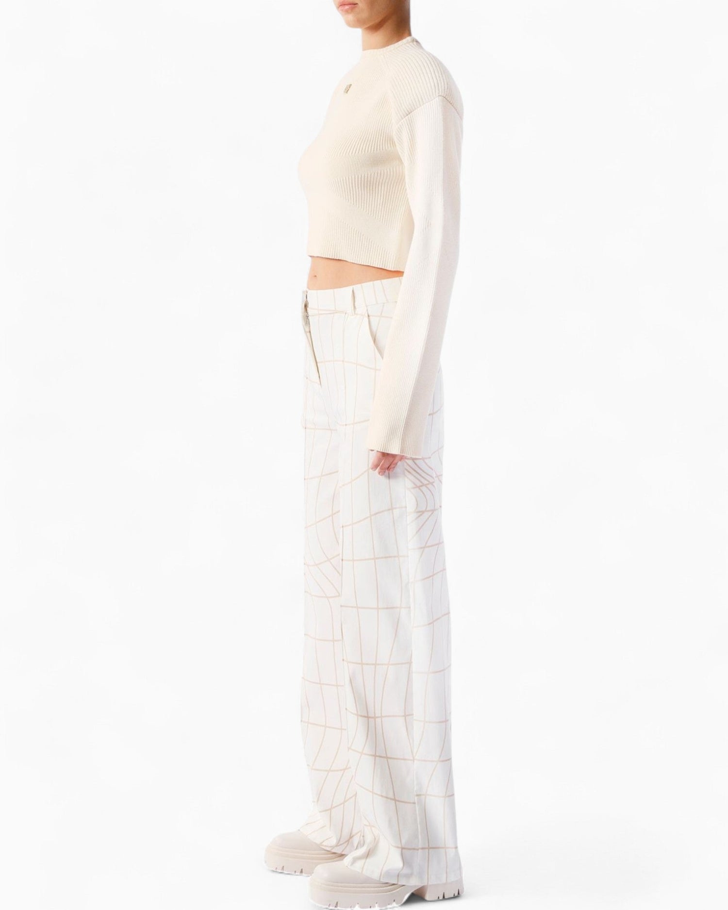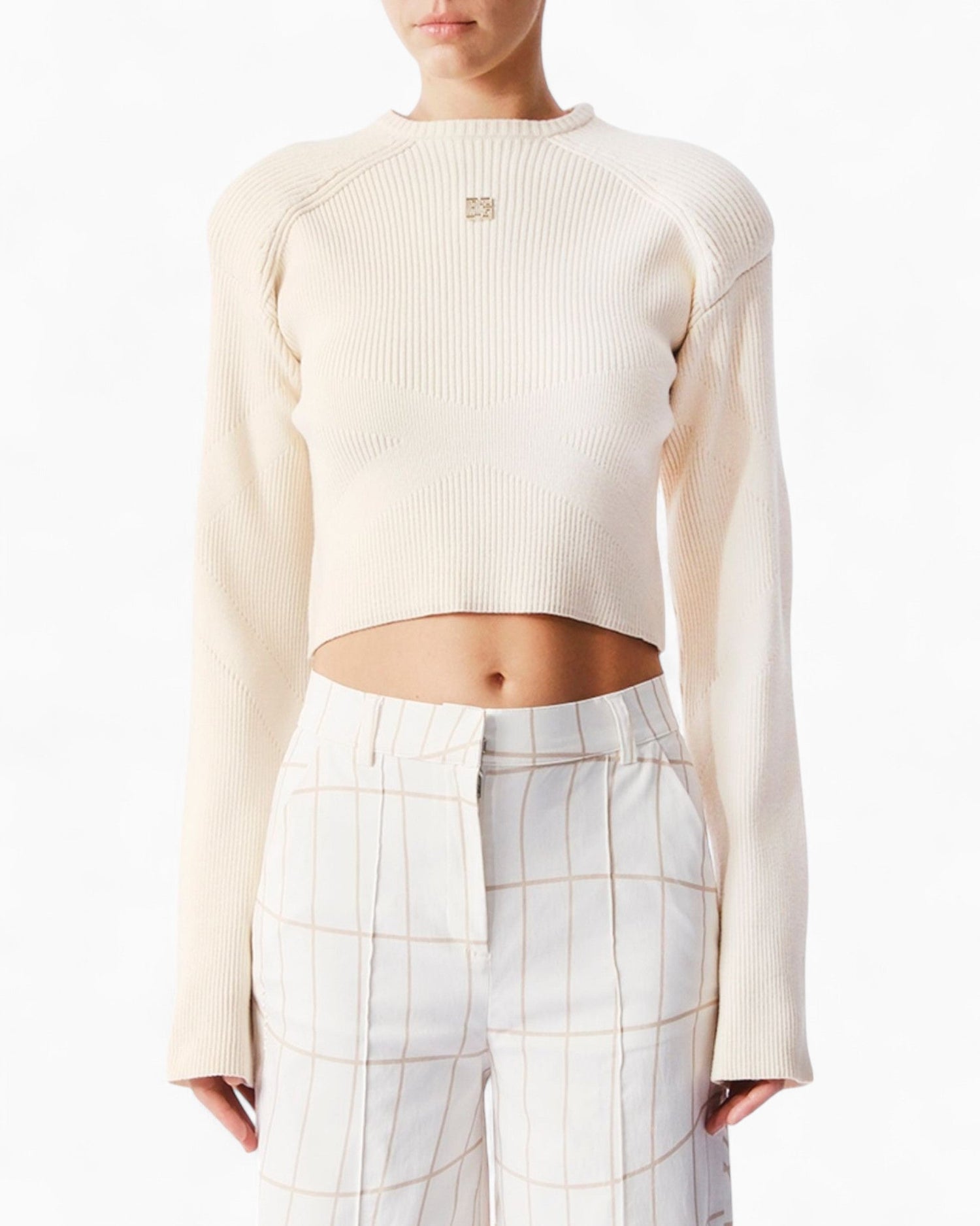FutureKnit Beige Crop Sweater has the KNTLGY gold logo on the front and X-shaped knitted design details on the arms and Size. This beige sweater, which stands out with its elegant design and special logo detail, brings elegance and elegance together.