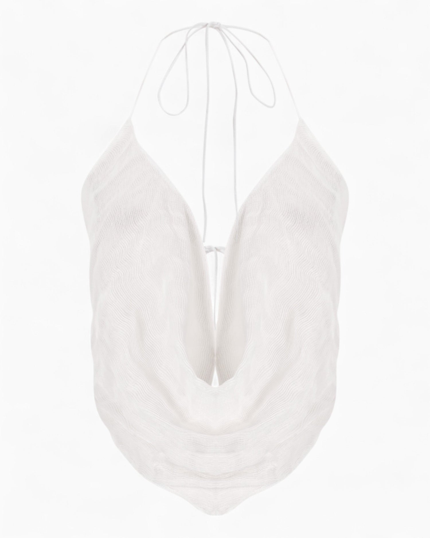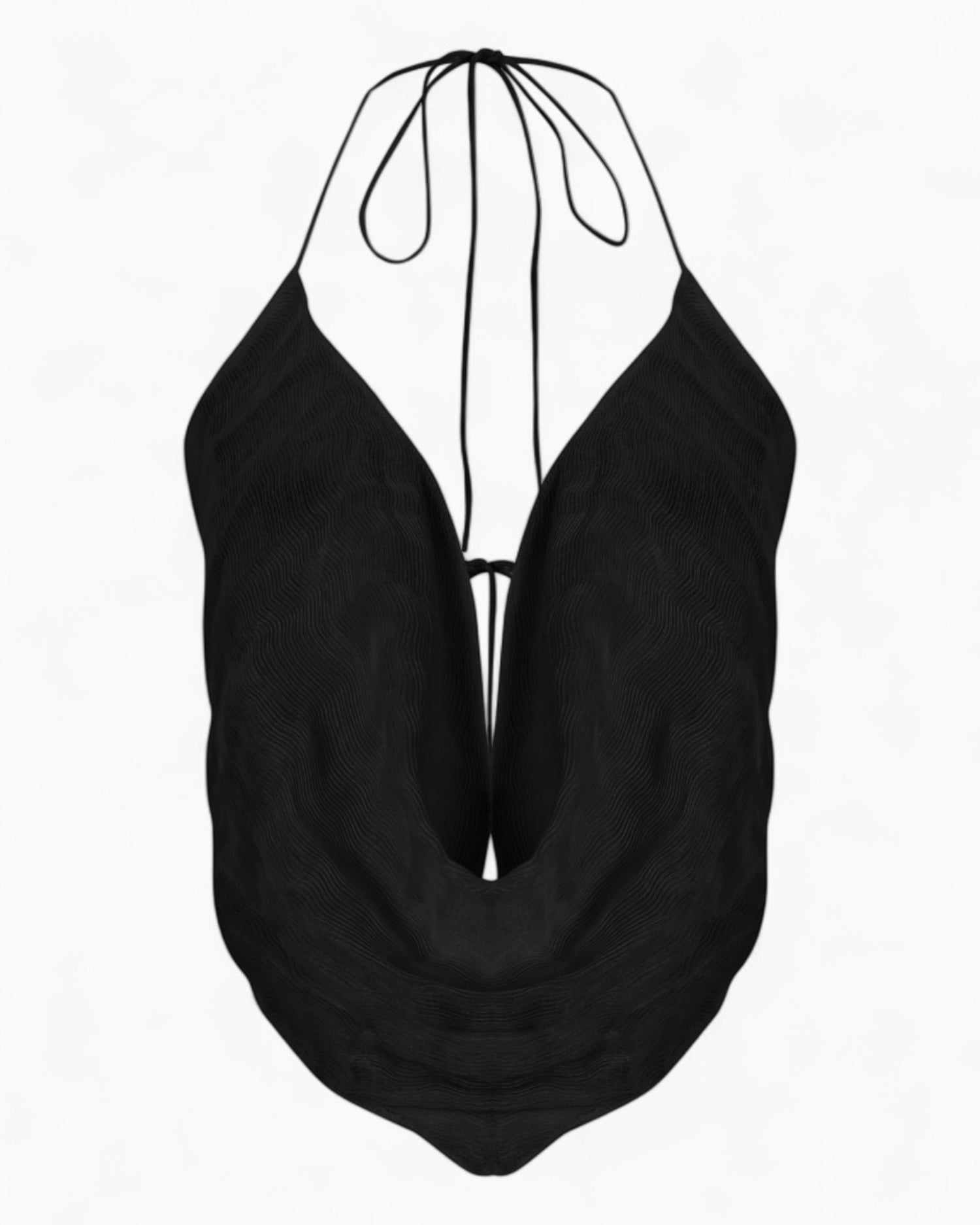 The Nocturnal Strappy Black Blouse stands out with its elegant yet bold design. Featuring a ruffled silhouette and a draped cowl neckline, it offers a distinctly feminine shape, while the delicate straps and open back detail add a modern, alluring touch. Its semi-sheer, fluid fabric flows gracefully with every movement, making it a statement piece for both day and night.