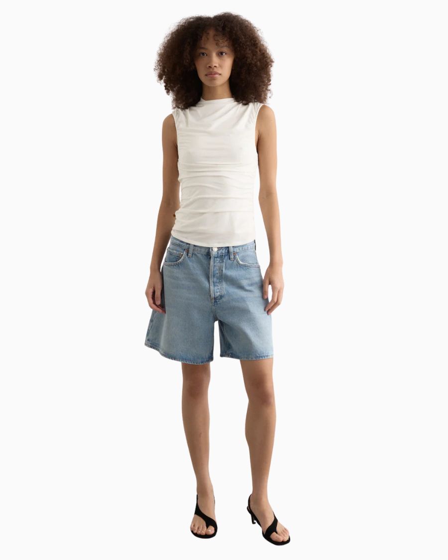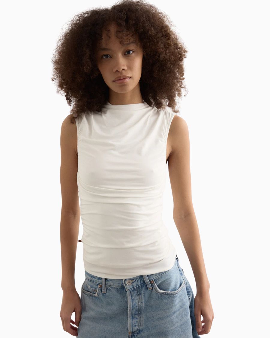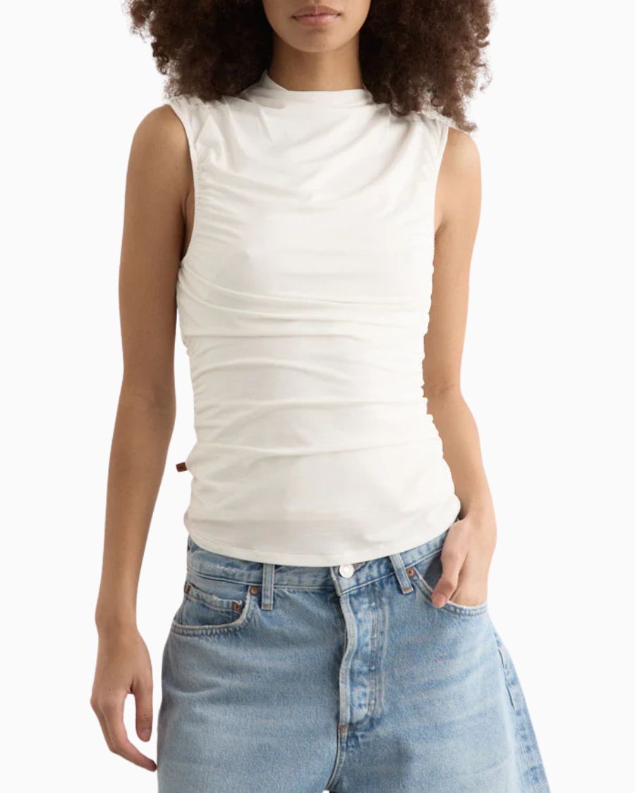 With its elegant draped high neck, striking ruching, and form-fitting silhouette, Cam Top is made for bold moments—whether you're heading out for the night or turning heads in the city. The fabric itself steals the show, offering a subtly sheer look that's fully lined to reveal just a hint of glow beneath.