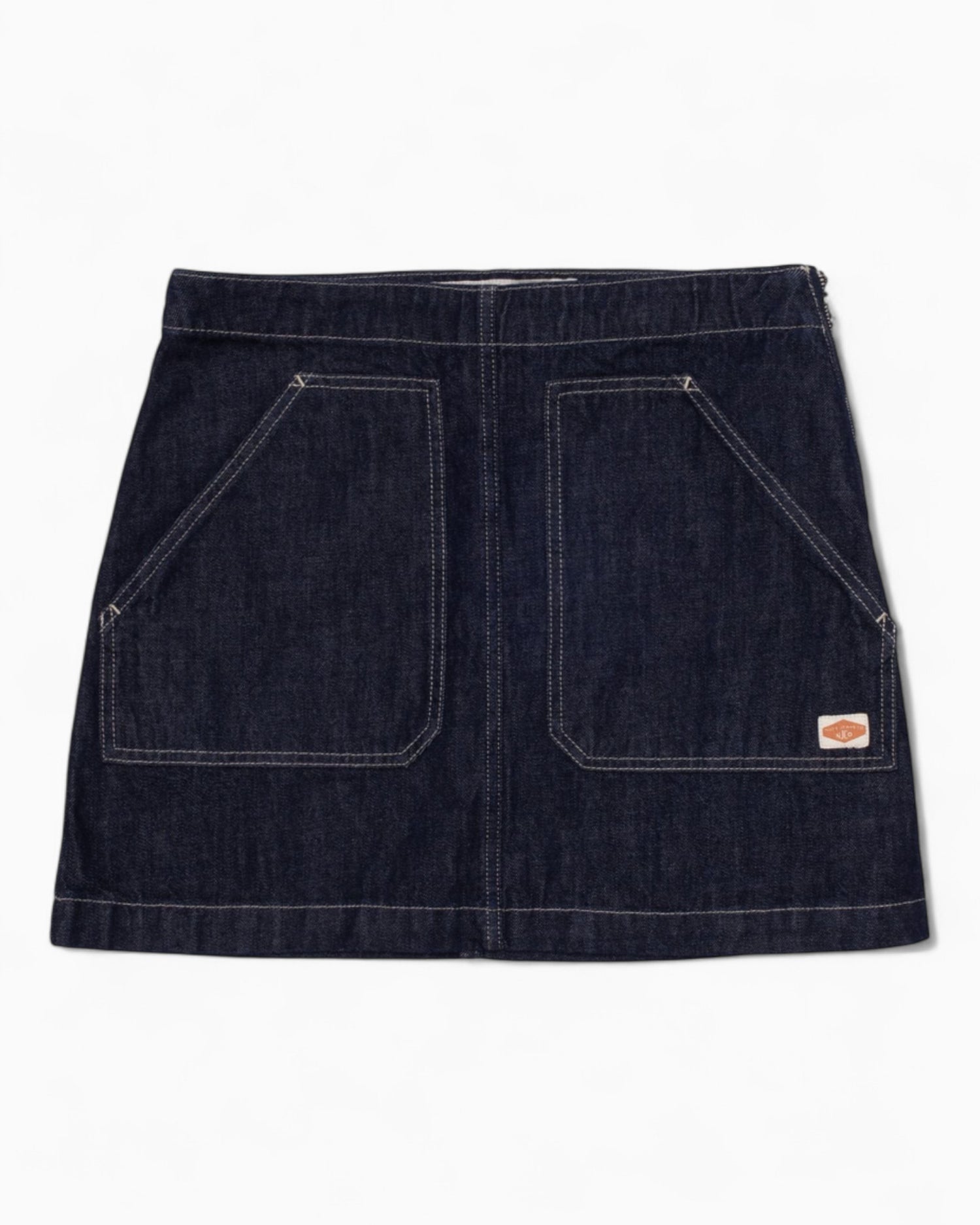 The Elvy Workwear Denim Women's Skirt combines classic workwear aesthetics with a refined, modern silhouette. Designed in a high-waisted A-line form, it offers a clean structure while maintaining everyday comfort. The skirt is detailed with front patch pockets, off-white stitching, and a side zip closure that creates a streamlined finish.