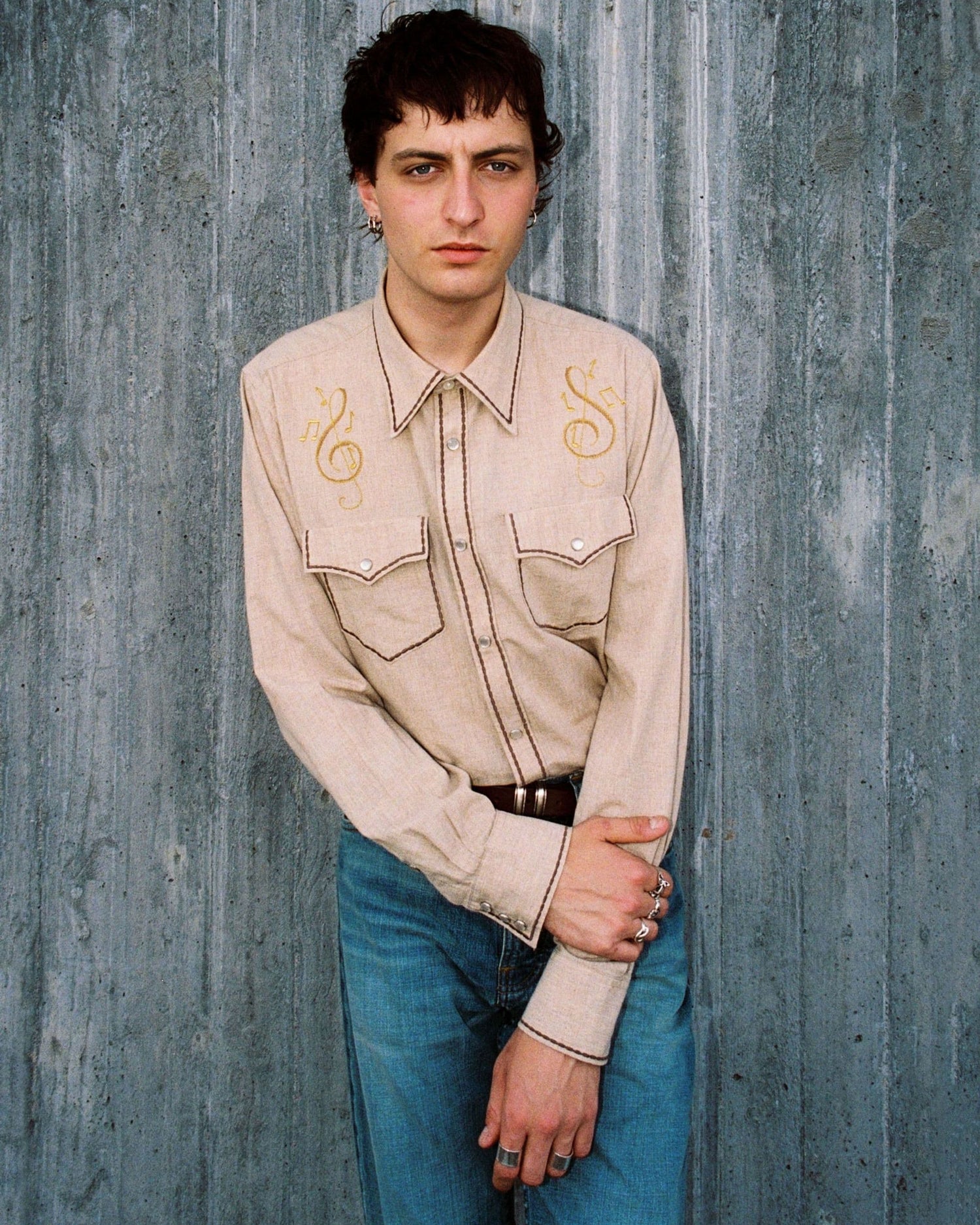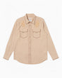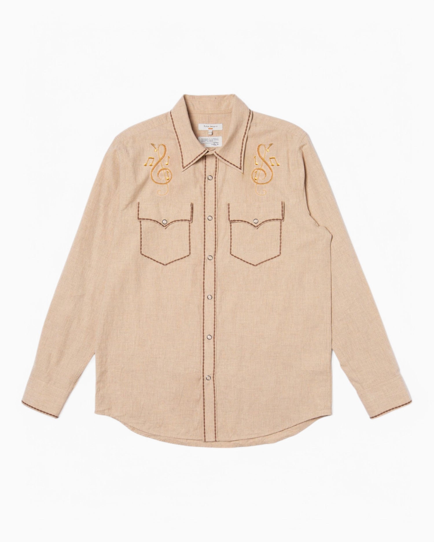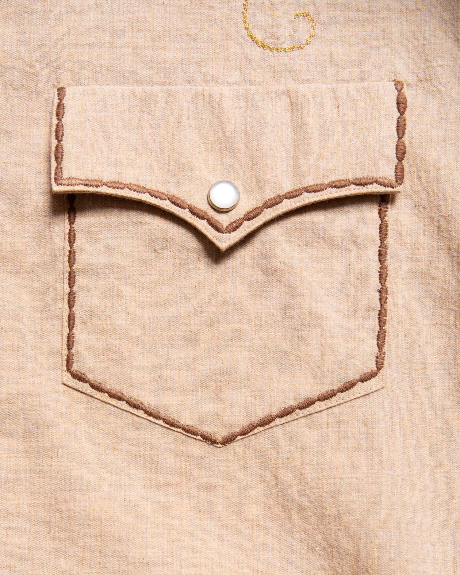 A classic cowboy shirt with a refined twist. Crafted from lightweight organic and Fairtrade cotton with a subtle melange effect, George stands out with intricate gold thread embroidery on the front. Contrasting decorative stitches along the edges add extra detail, while a rounded hem, pointed back yoke, and pocket flaps enhance the Western-inspired design. Finished with elegant glass prong snap buttons for a timeless touch.