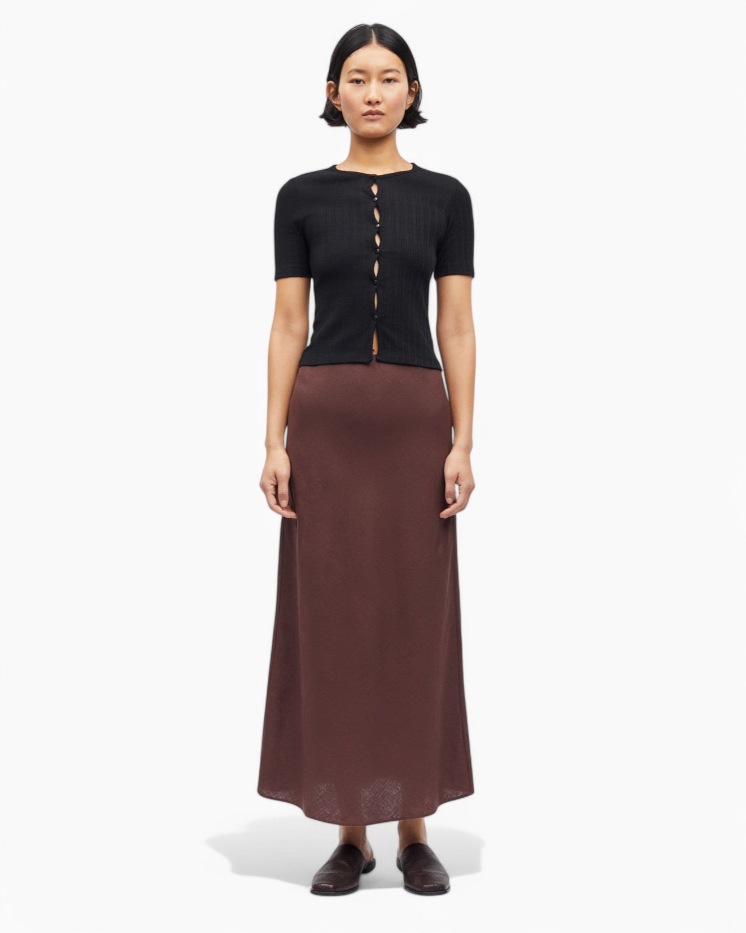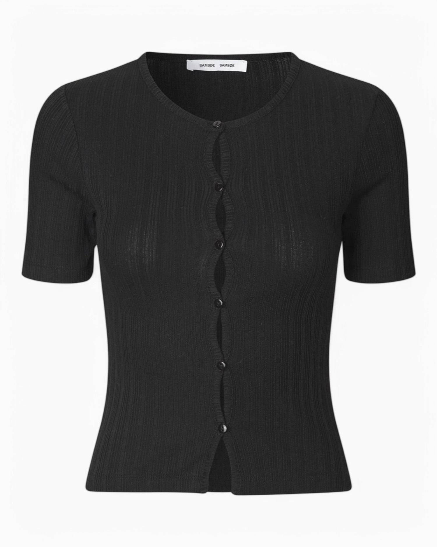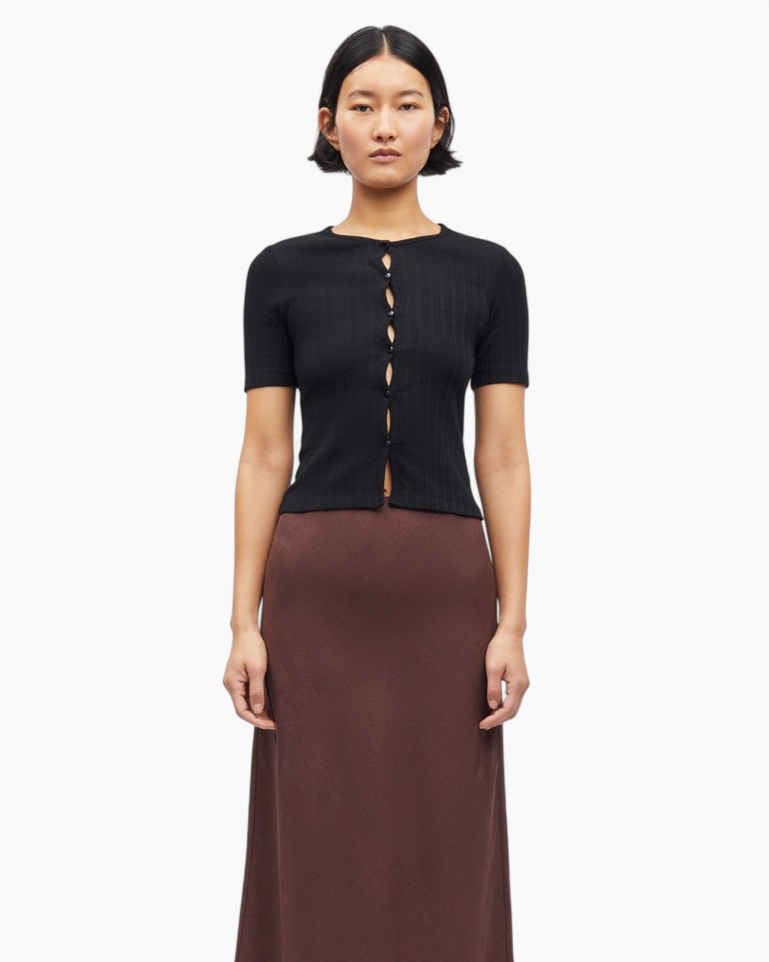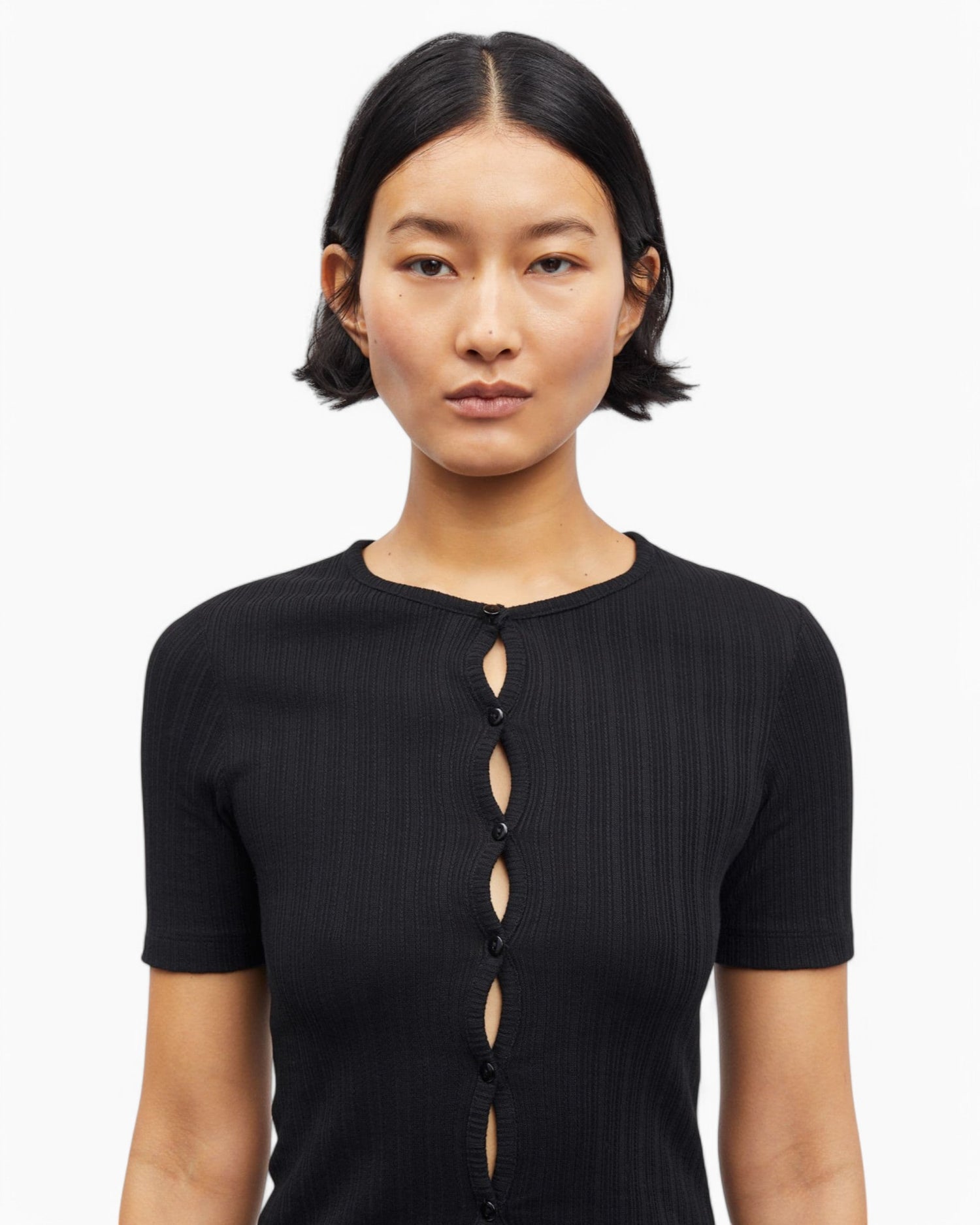 Slim fit, rib-knitted cardigan with a crew neck and front button closure. Made from 100% organic cotton and GOTS certified for responsible production at every stage.