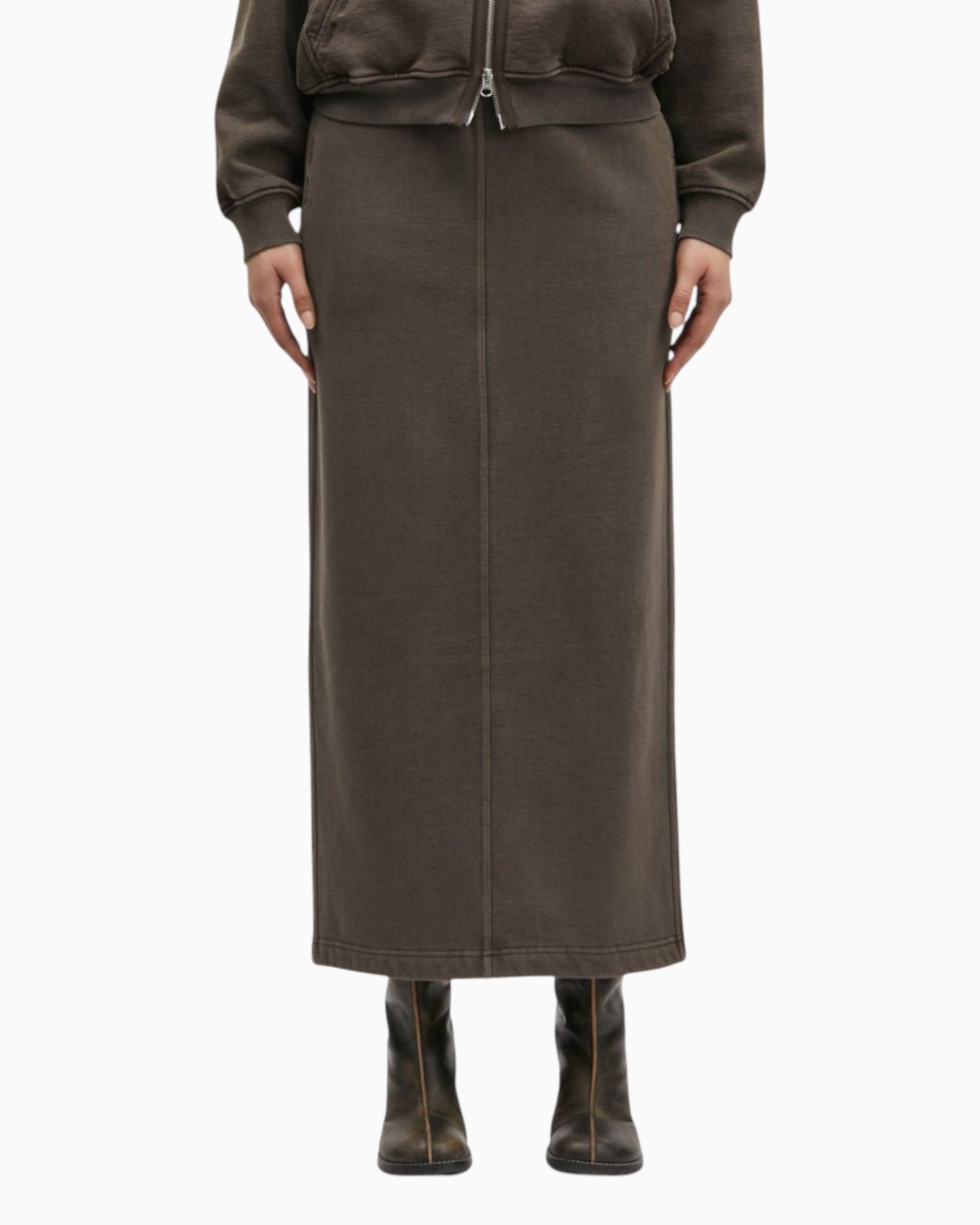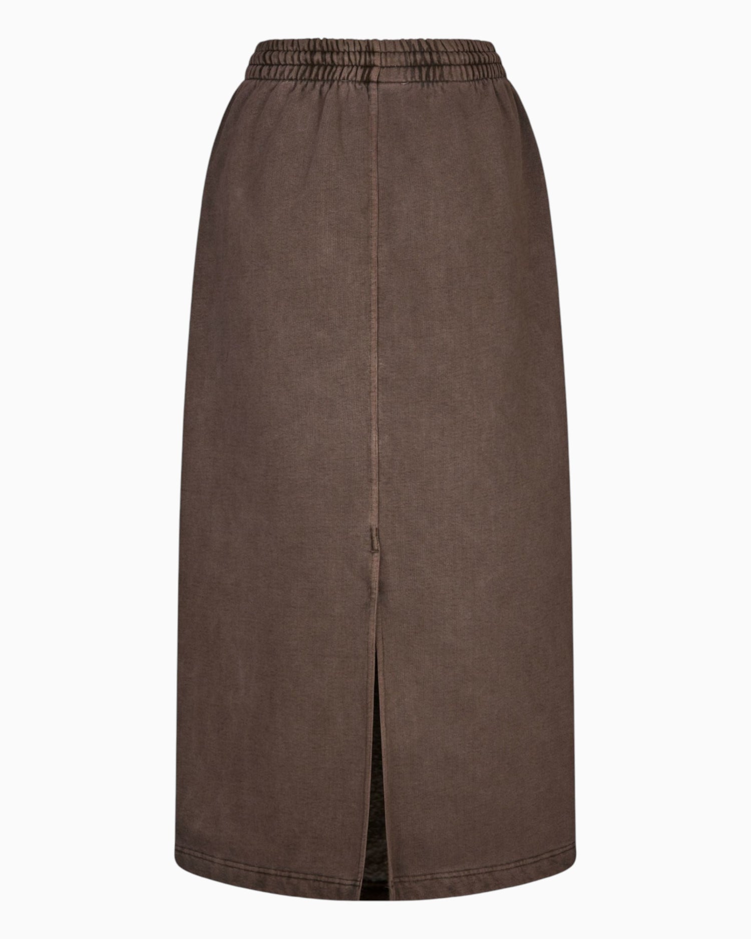 Jersey maxi skirt with a regular fit. Elastic drawstring waistband. Mid-waist. Side slit pockets on the front. Slit at the back. Embroidered Samsøe Samsøe branding at the pocket. Brown and black wash. Main material made from a blend of organic cotton and cotton.
