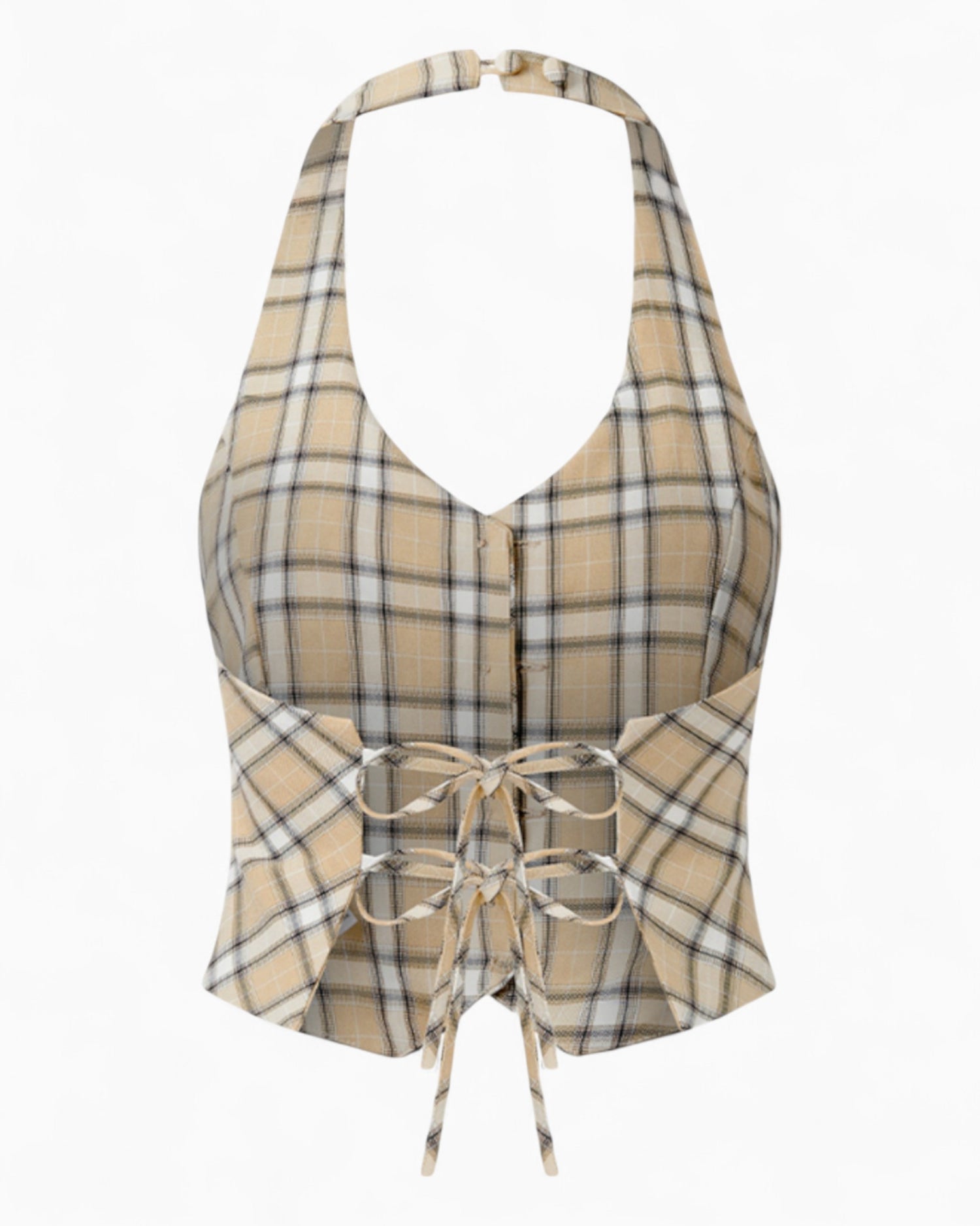 - Halter neck with button closure, adjustable back ties