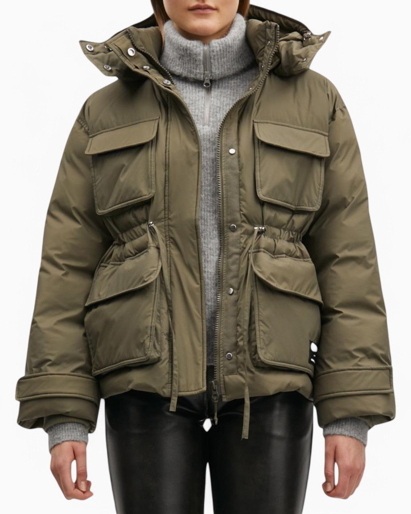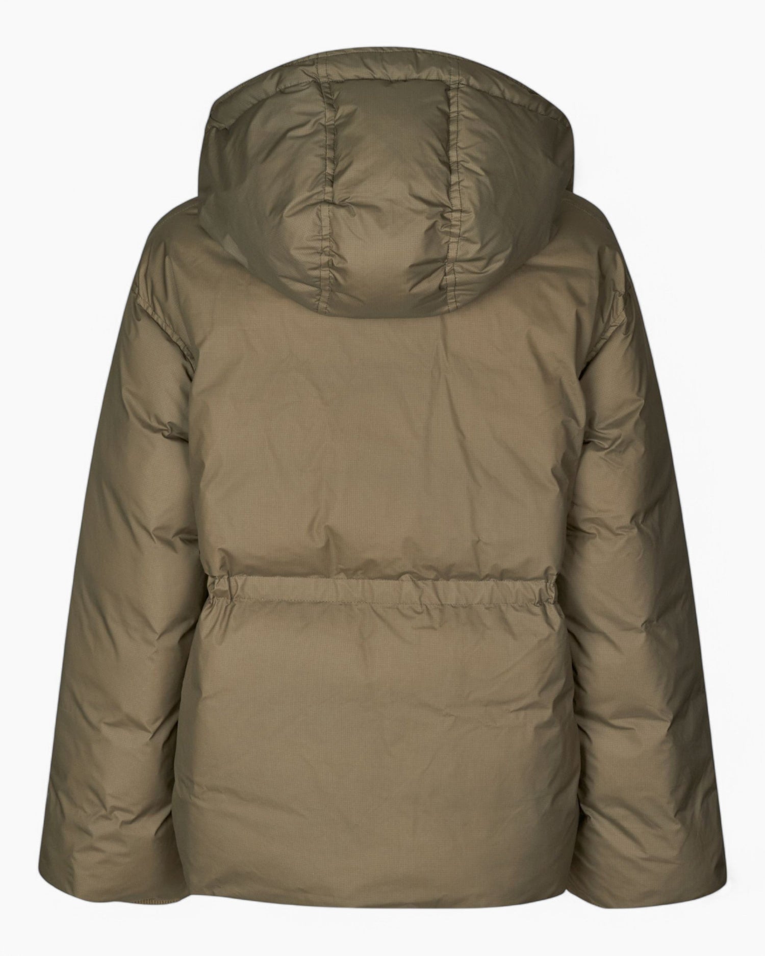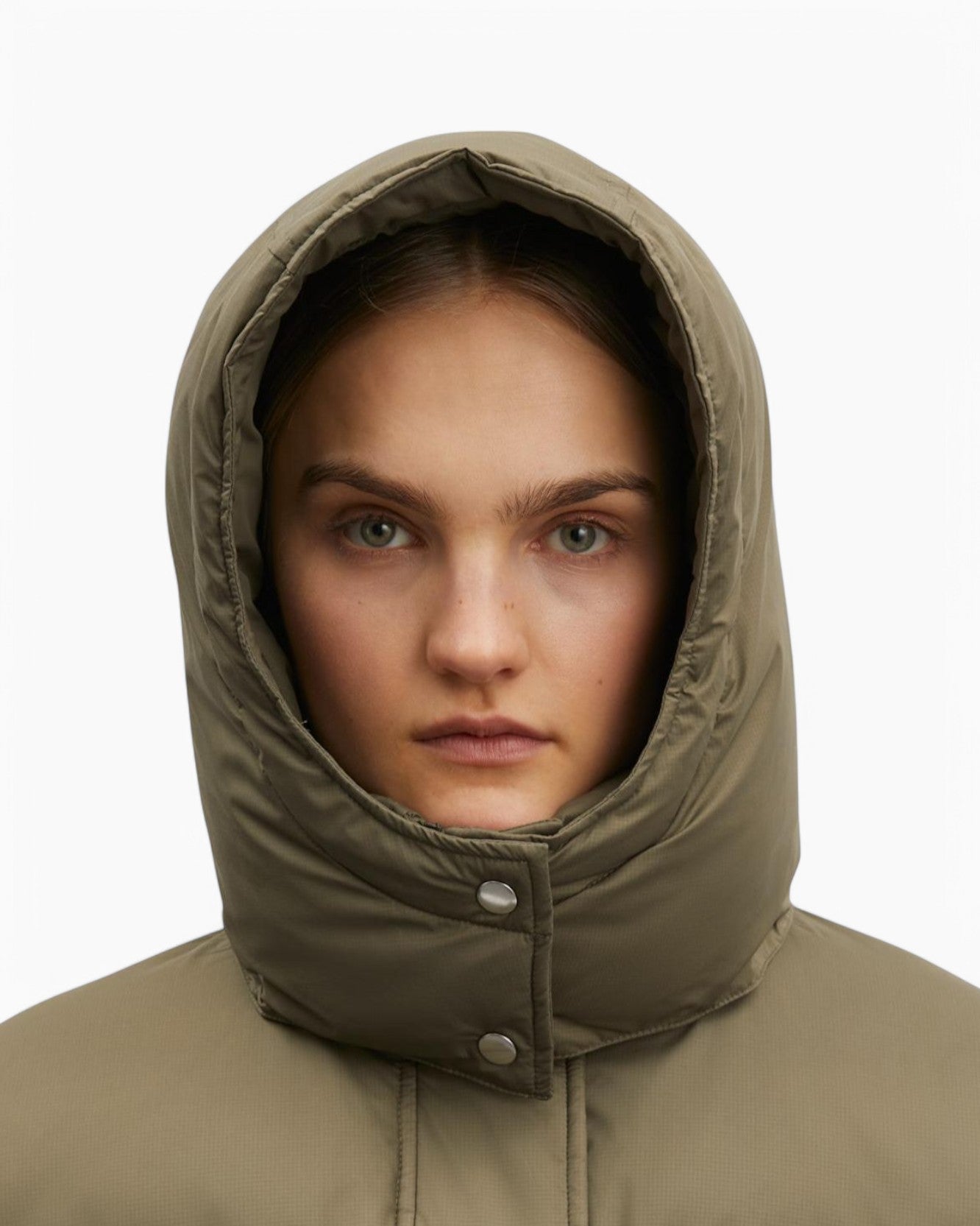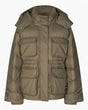 Puffer jacket with an oversized fit and dropped shoulders. Zipper and snap button closure on the front. Detachable hood, snap buttoned cuffs, and drawstring waistband. Patch pockets with velcro closure on the front. Branded patch on the front pocket. Padded with PrimaLoft® ThermoPlume®. Main lining made from ripstop. Main material made from the water-resistant and windproof WINDSTOPPER® material by GORE‑TEX LABS.