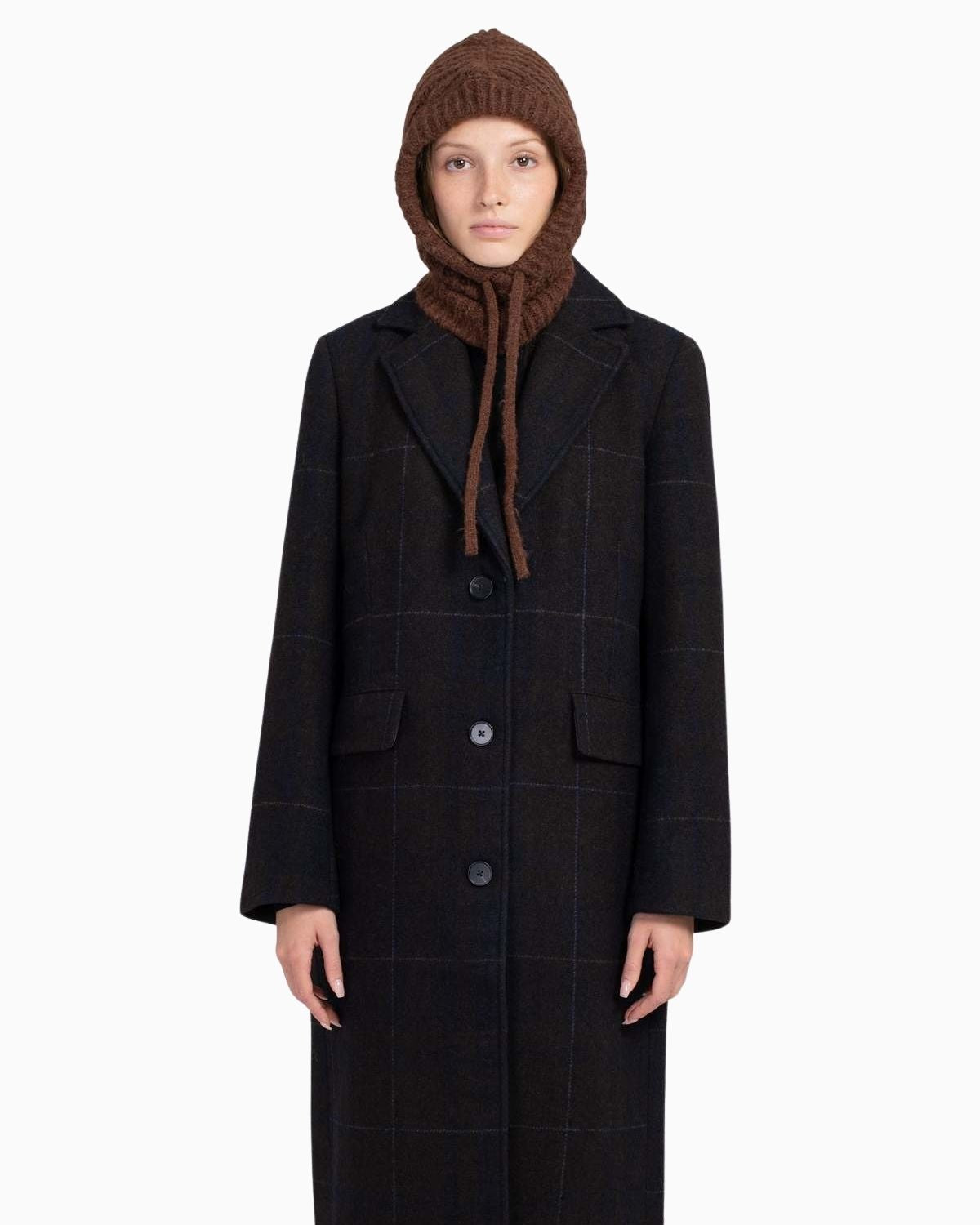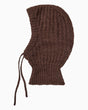 Knitted balaclava. Rib-knitted trims. Drawstring at the hood. Main material made from a blend with alpaca wool and wool.