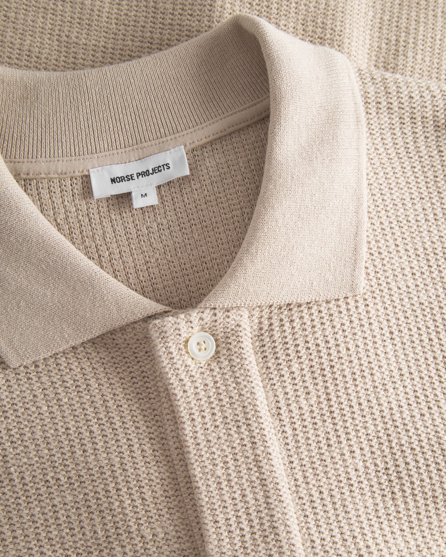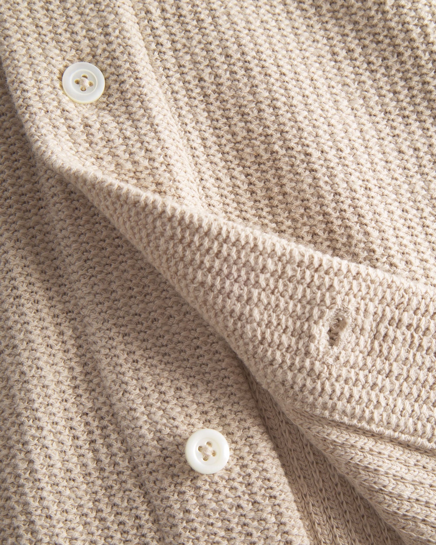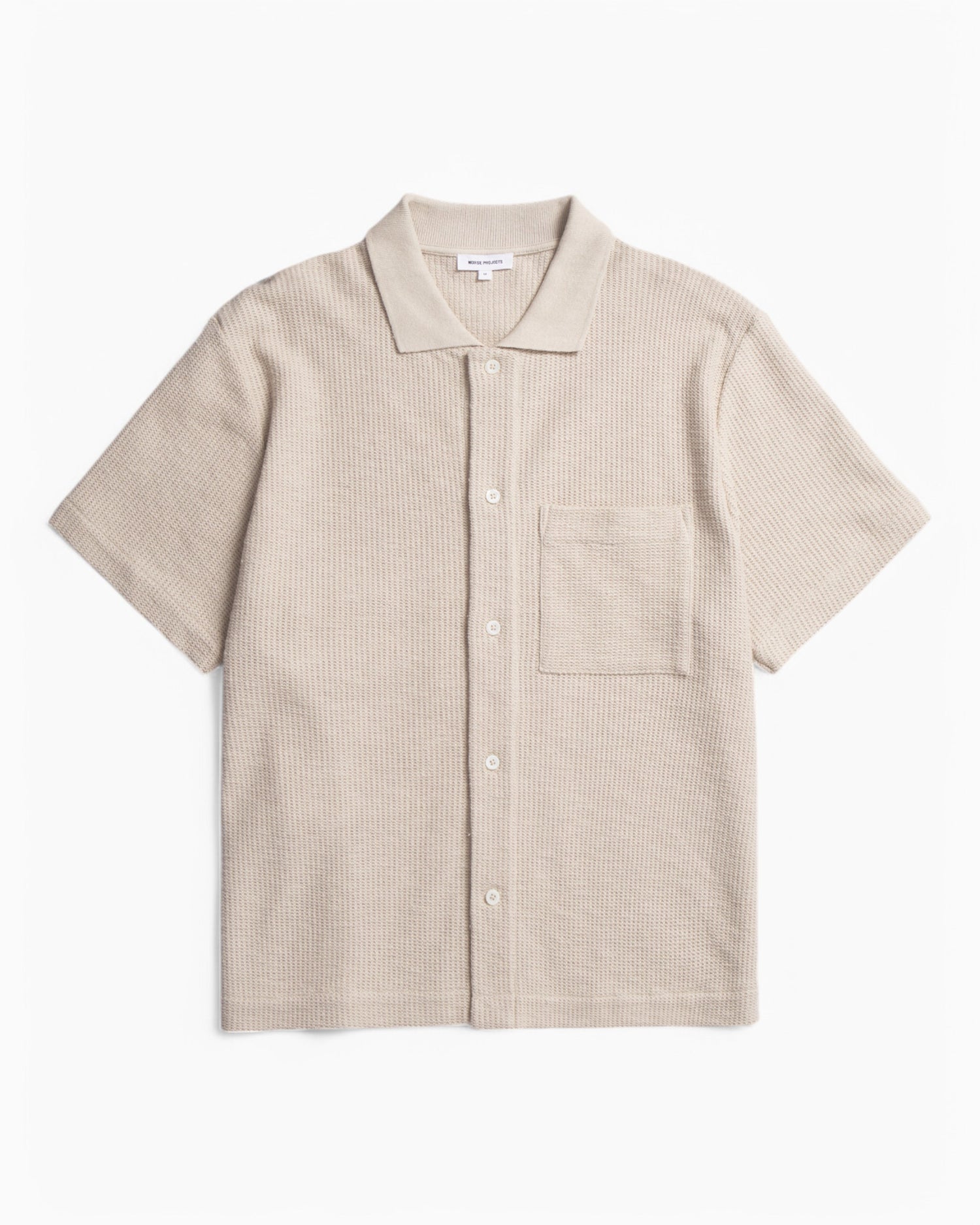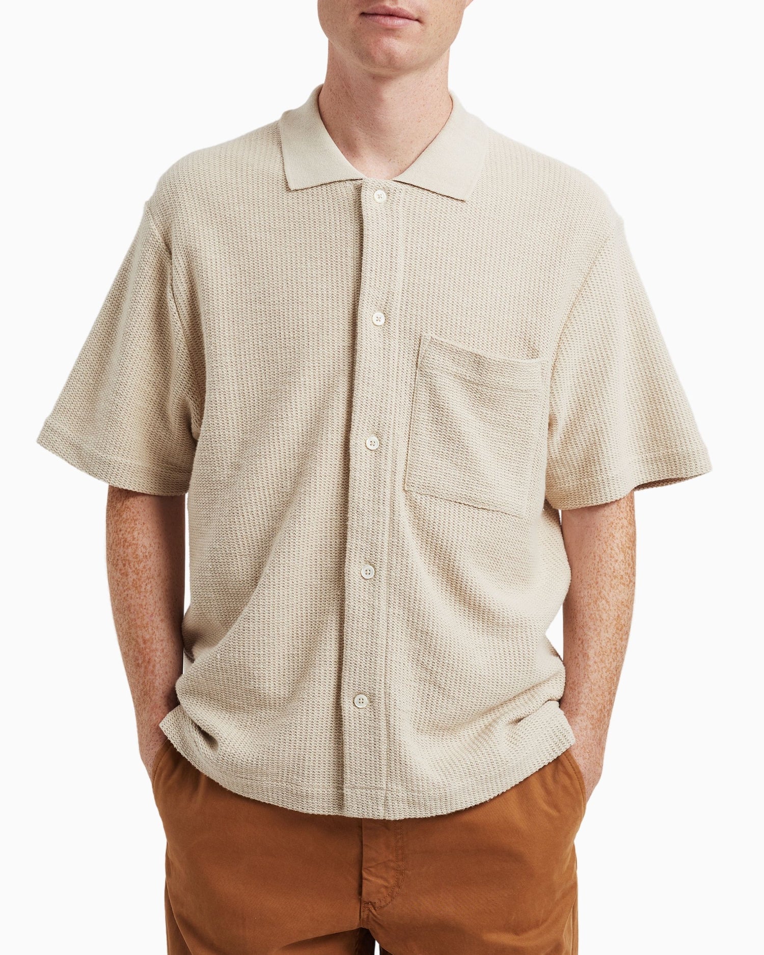 A relaxed fitting short sleeve shirt cut from a heavyweight jersey with a breathable open structure. It features a knitted collar, a chest pocket and button through placket.