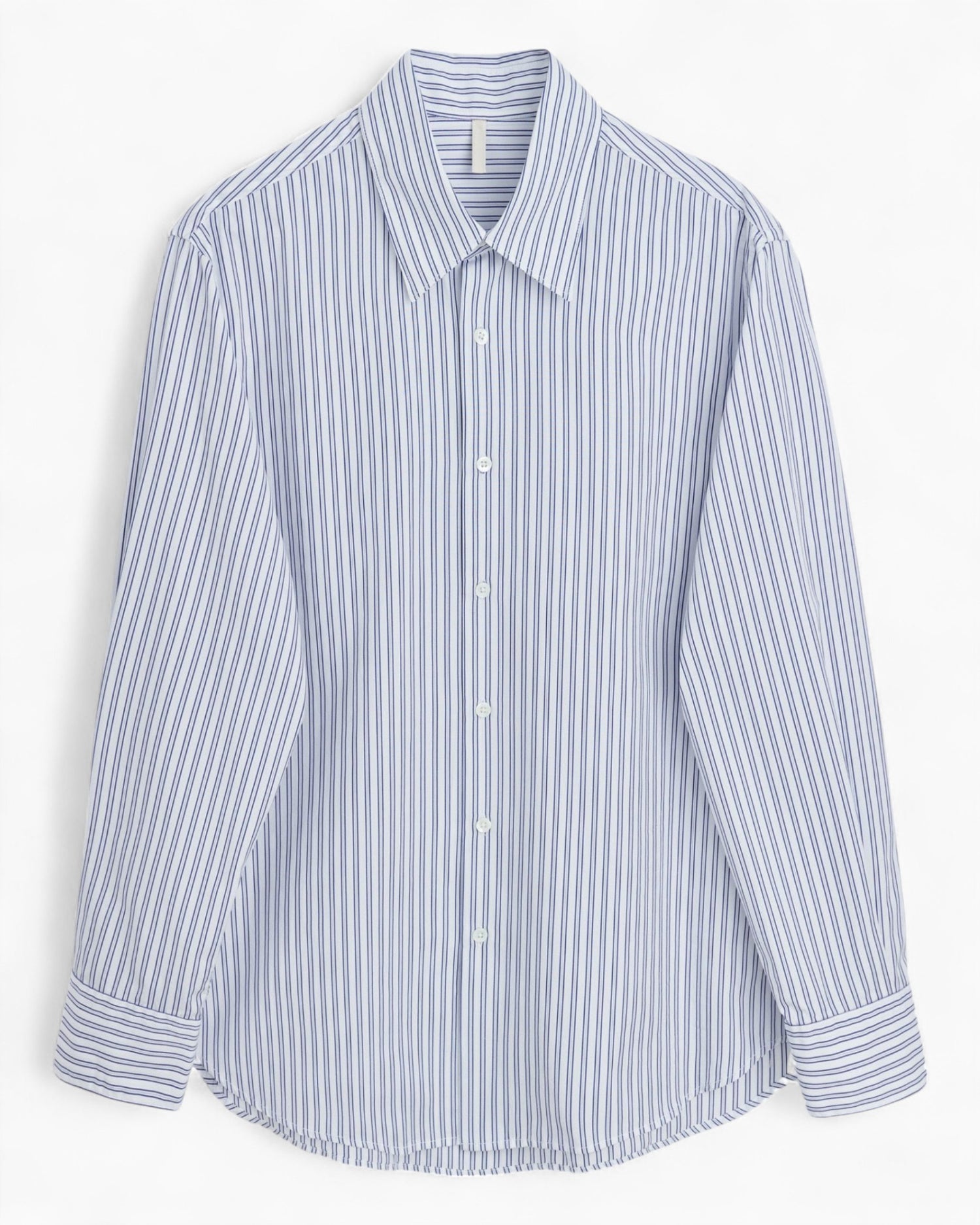 The Base Shirt features a relaxed fit with a split collar, crafted from 120's poplin yarn-dyed in blue stripes for a classic and stylish look. Real mother of pearl buttons and a curved hem add elegant finishing touches. Made from 100% cotton, it offers ultimate comfort and breathability.