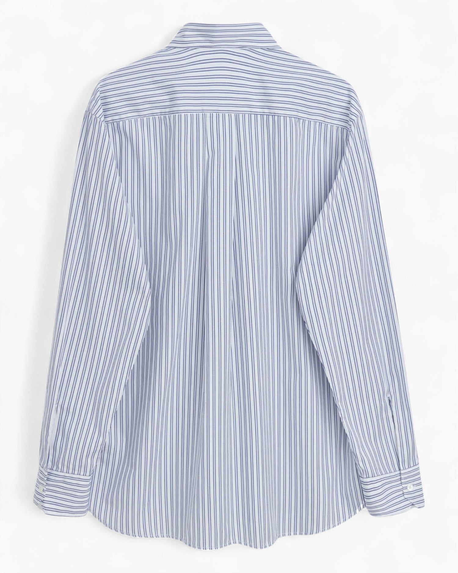 - 120's poplin yarn-dyed in blue stripes for a timeless design
