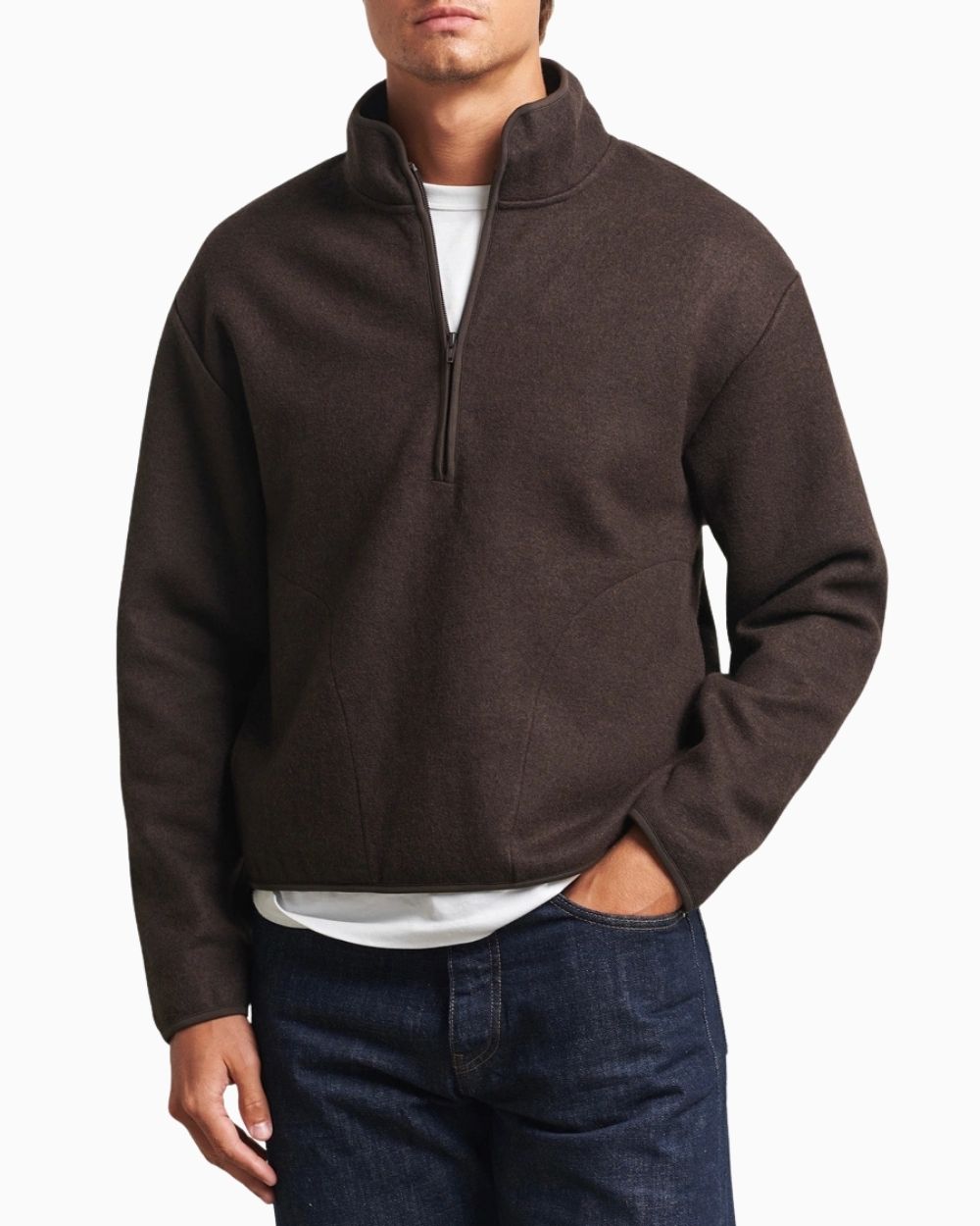 Wool Half Zip is crafted from a heavyweight jersey fabric blended with wool and cotton. The material strikes the perfect balance between breathability and warmth, while contrast binding along the edges adds both style and durability. Designed with a high collar and coiled half-zip, it also features hidden side pockets and a relaxed fit for everyday comfort.