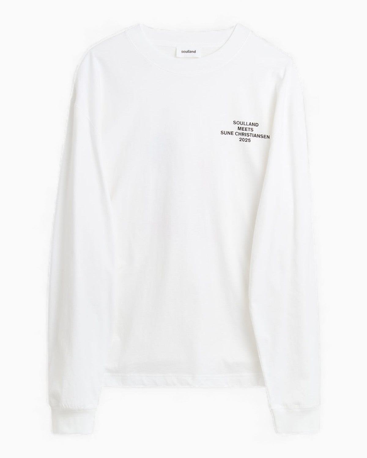 The DEREK longsleeve t-shirt comes in a boxy fit with a soft 150 g/m² jersey feel. It features ribbed cuffs and neckline, reinforced twin-needle stitching for durability, and screen-printed artwork on both the front and back by Sune Christiansen.