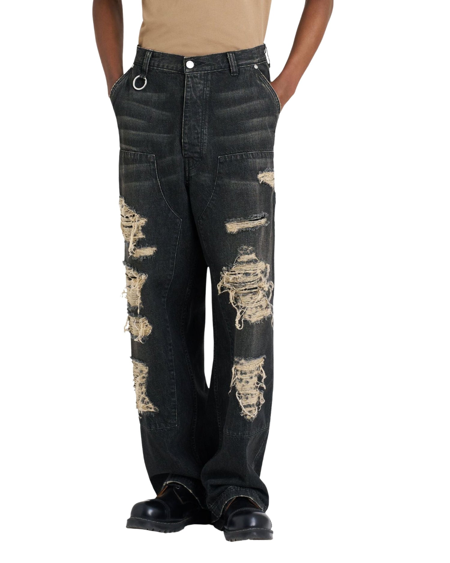 The Loose Carpenter Pant is a durable, large-fit pant with a distressed finish and reinforced double-knee construction. Featuring double-layer front leg panels with rivets, these pants include tool pockets and a hammer loop for added functionality. Design elements include Études Studio rivets and an engraved key holder at the belt loop. Made from 100% cotton and machine washable at 30°C.