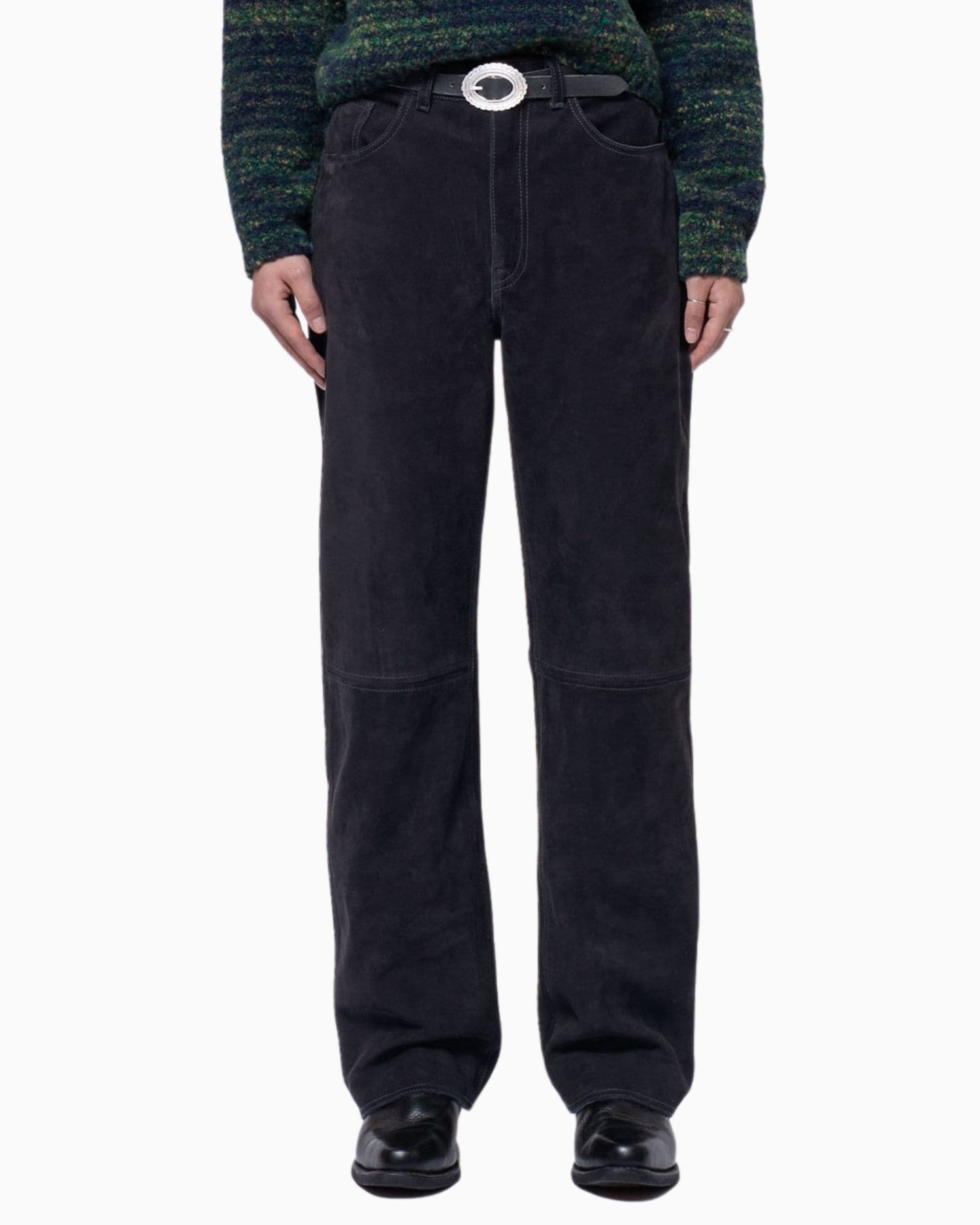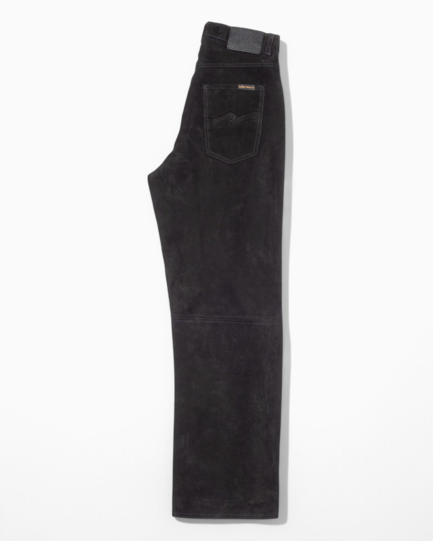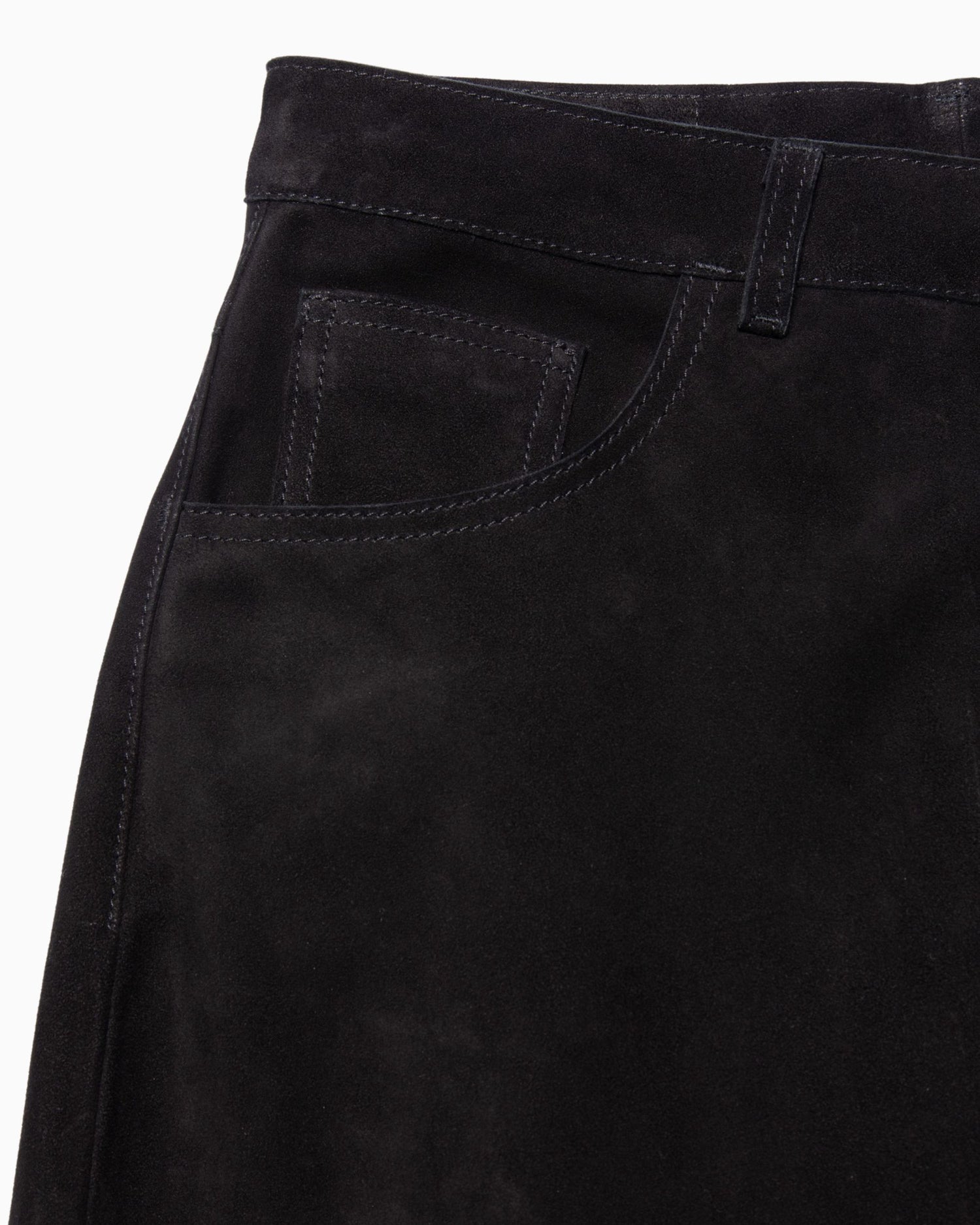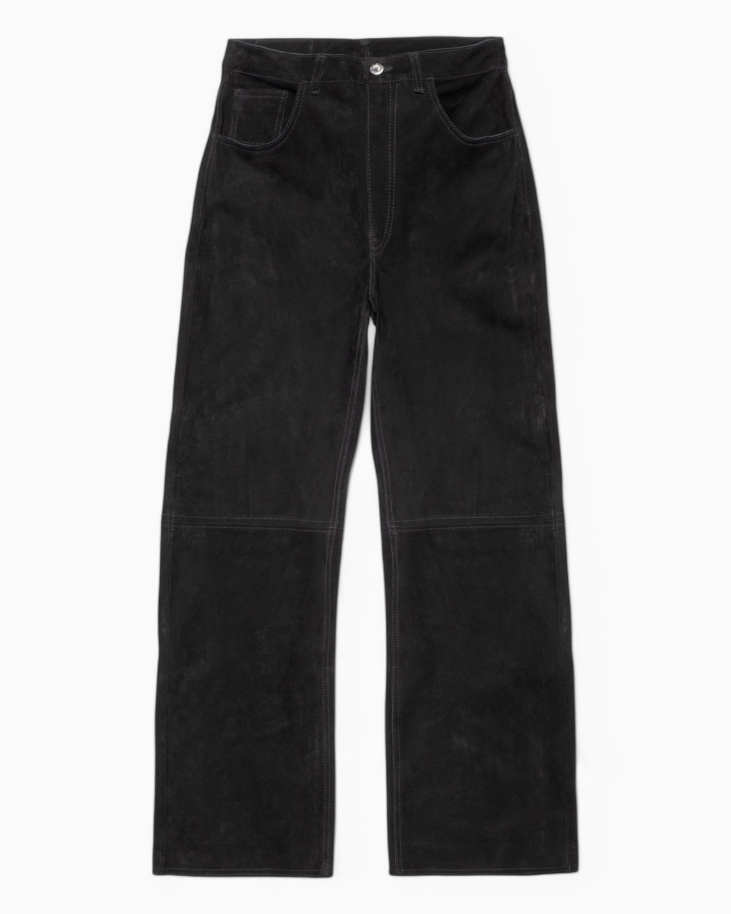 Crafted from luxuriously soft, jet-black goat suede, these pants offer a refined take on a classic wide-leg fit. They share the same cut and details as our denim version, featuring a loose fit, high waist, and wide leg. For added comfort, the pants are lined with recycled polyester from the waist to the knee, woven for slight elasticity.