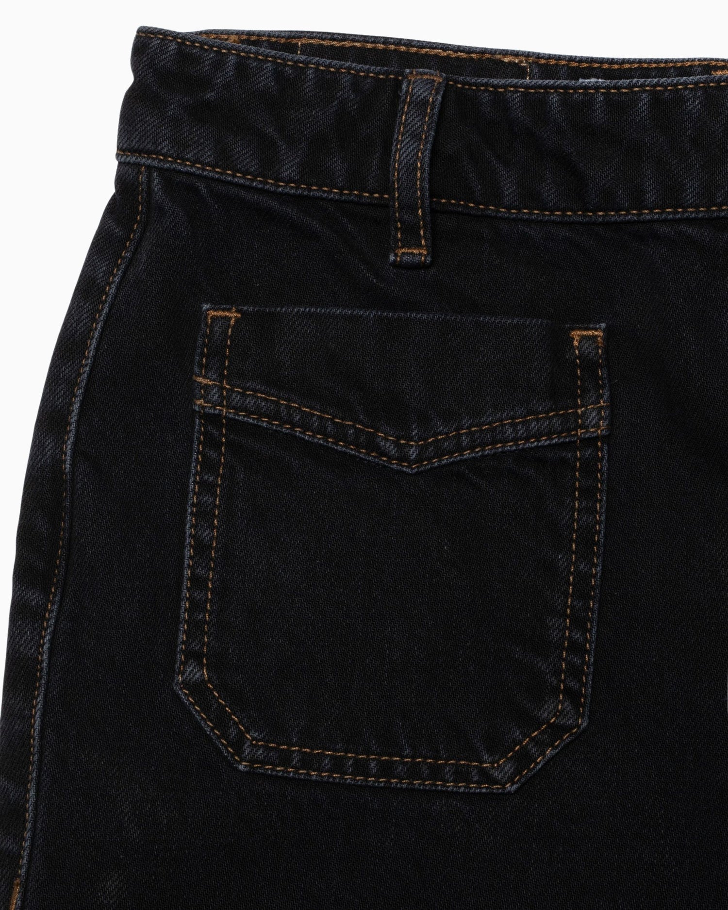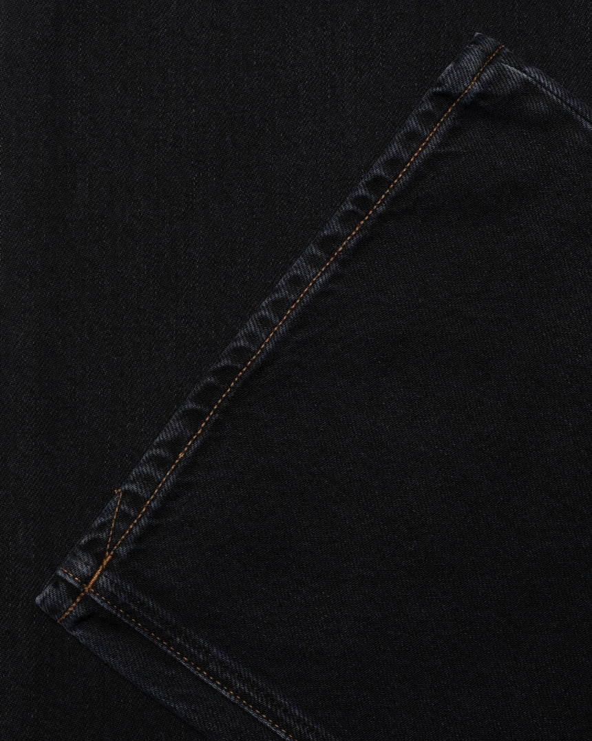 Crafted from washed black denim, the fabric highlights the natural texture of cotton, while brown contrast stitching and vintage-inspired copper details add timeless appeal. The jacron patch and classic four-pocket construction complete this elevated take on western denim.
