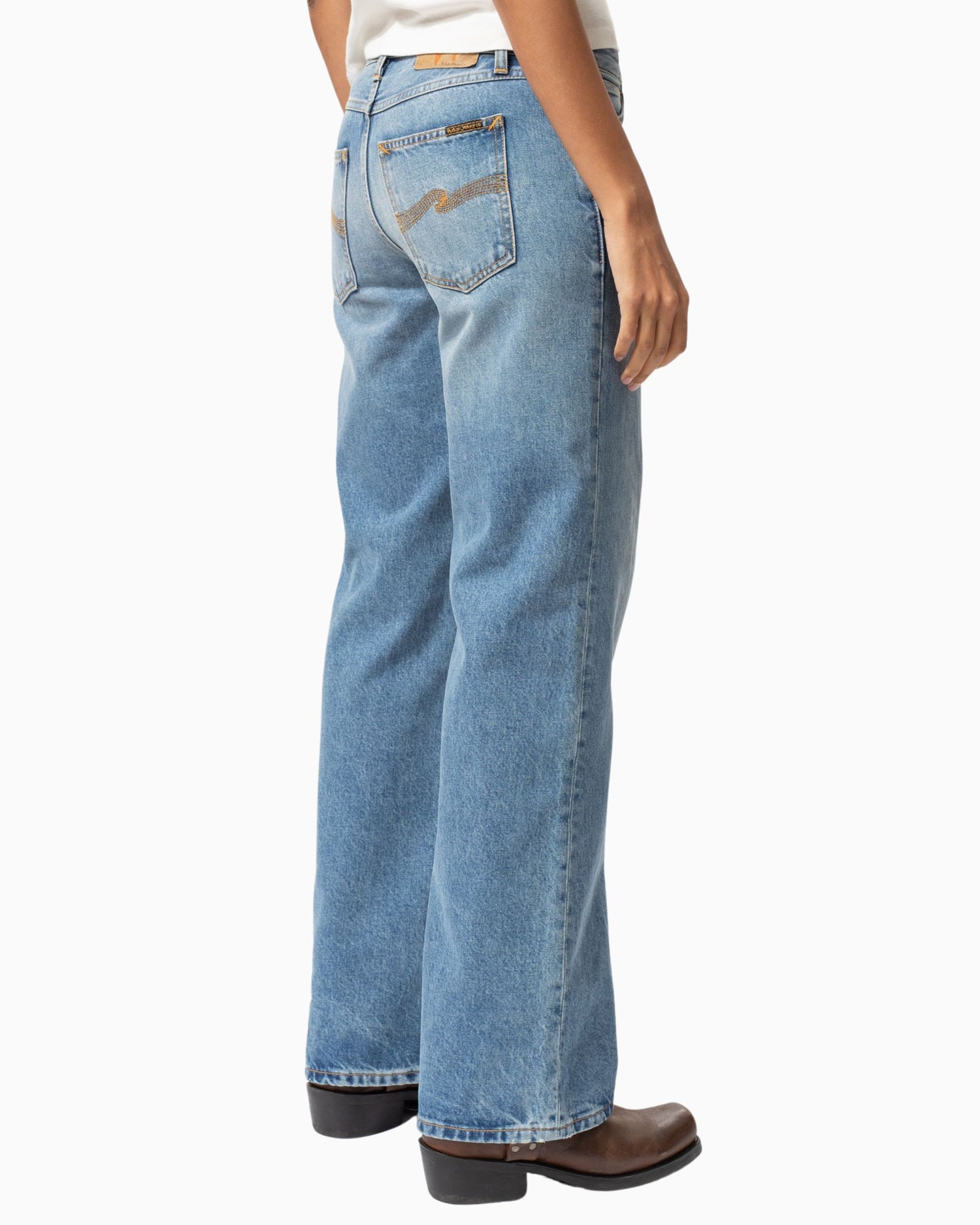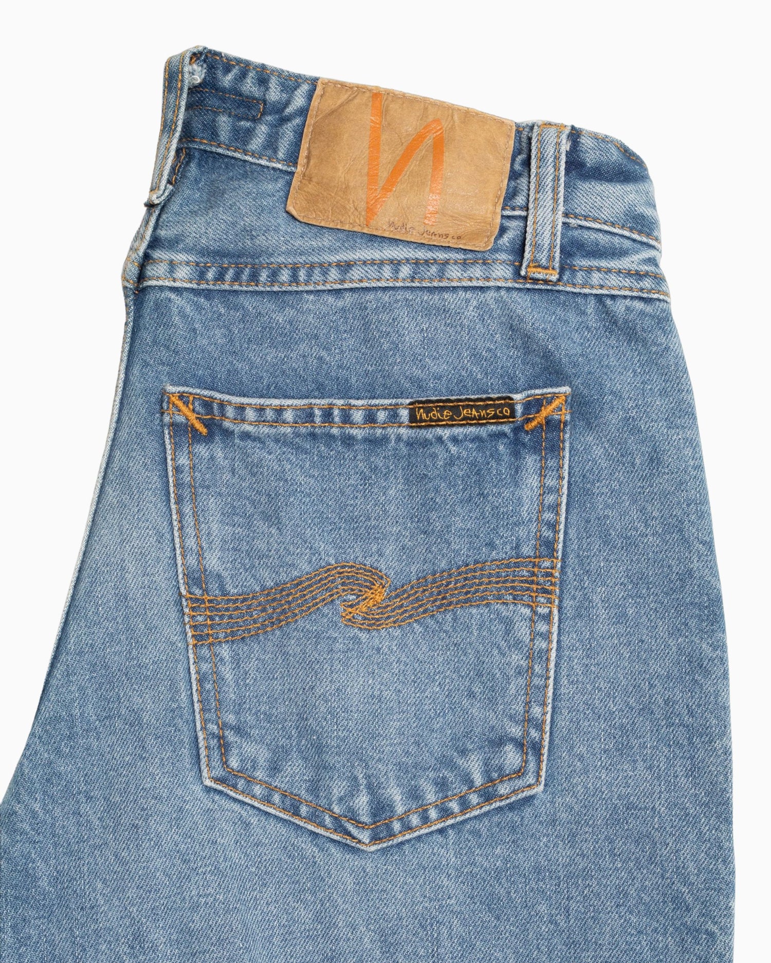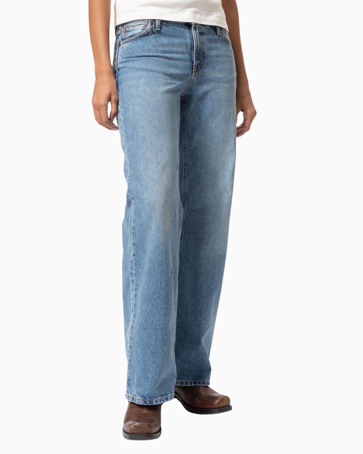 These jeans offer a loose, low-waist fit with a wide leg, finished in a light blue wash for an authentic worn-in look. Crafted from a newly favored 13.3 oz. rigid denim, they strike the perfect balance of texture and depth. Short, defined slubs create subtle streakiness, while crosshatch and marble effects add a true vintage feel. With a dense weave and robust hand, they embody classic denim craftsmanship.