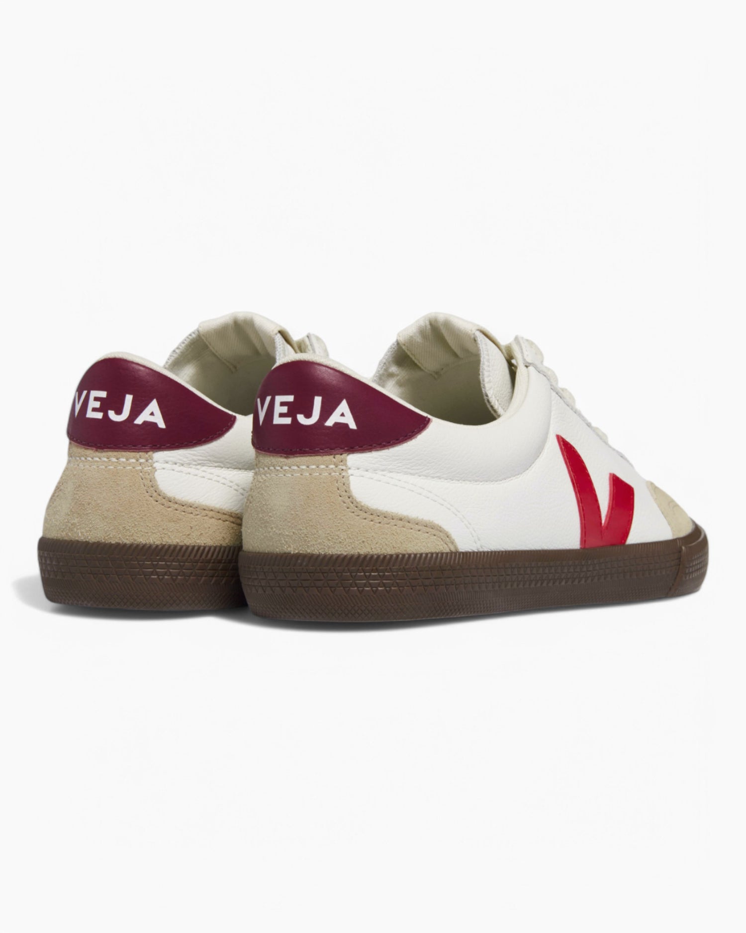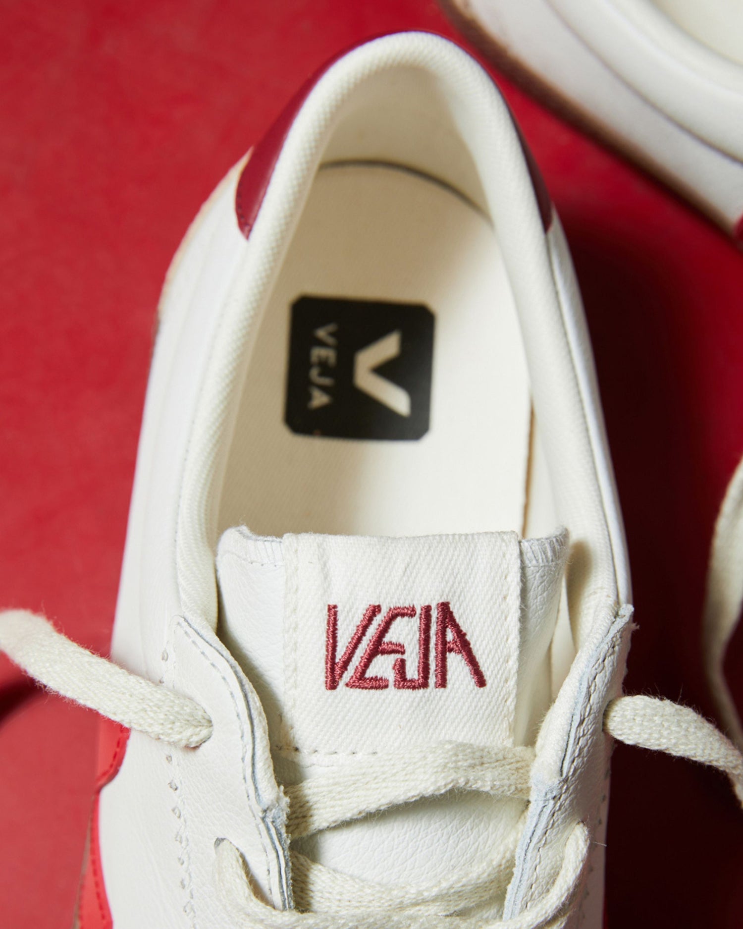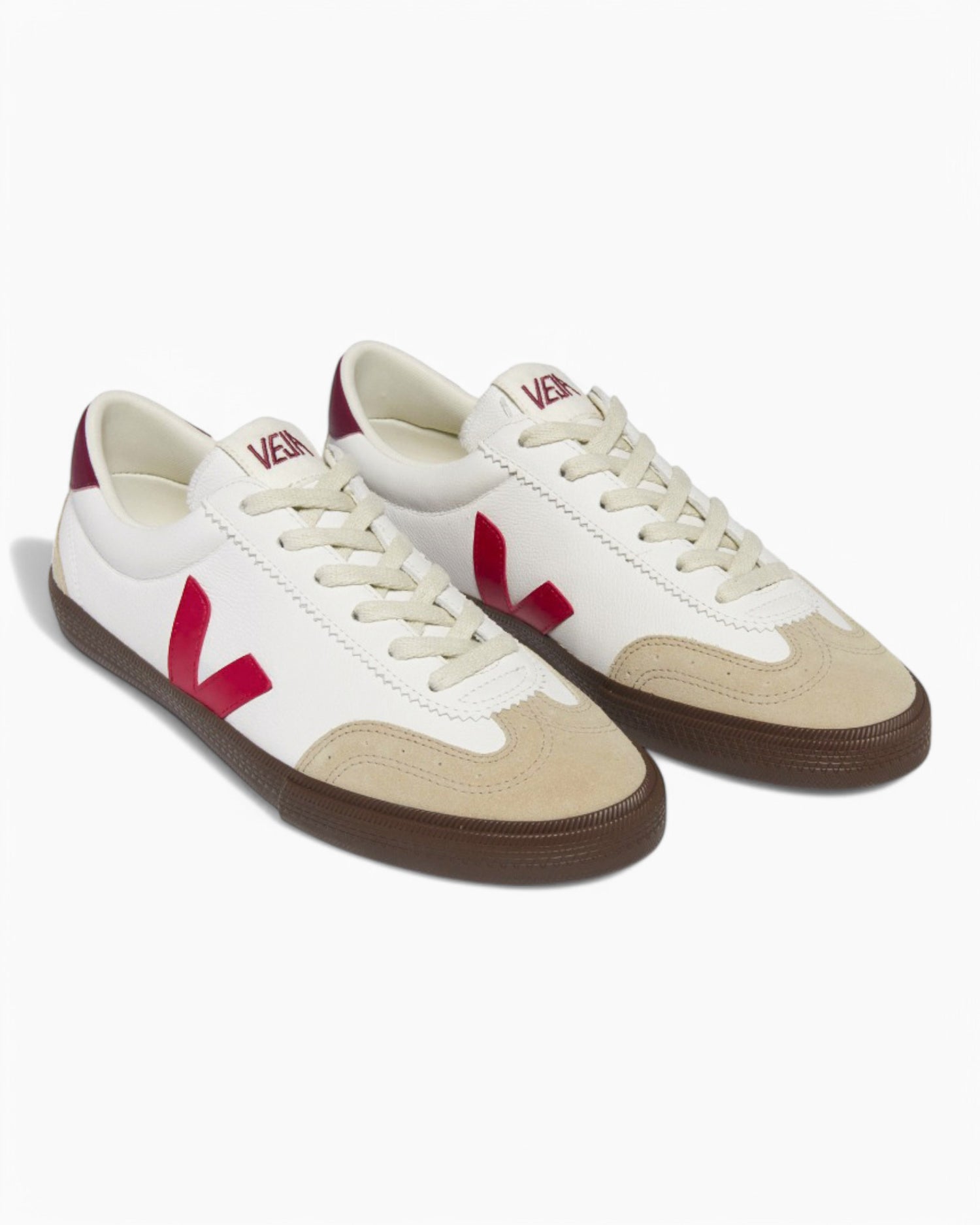 Volley is VEJA's first model, launched in 2005, inspired by the Brazilian volleyball shoes of the 70s. Volley Organic Traced Leather is produced with 100% certified organic leather from farms in Uruguay. The leather undergoes a mechanical beating process that makes it thin and pliable. The logo on the tongue of the sneaker is VEJA's first logo.