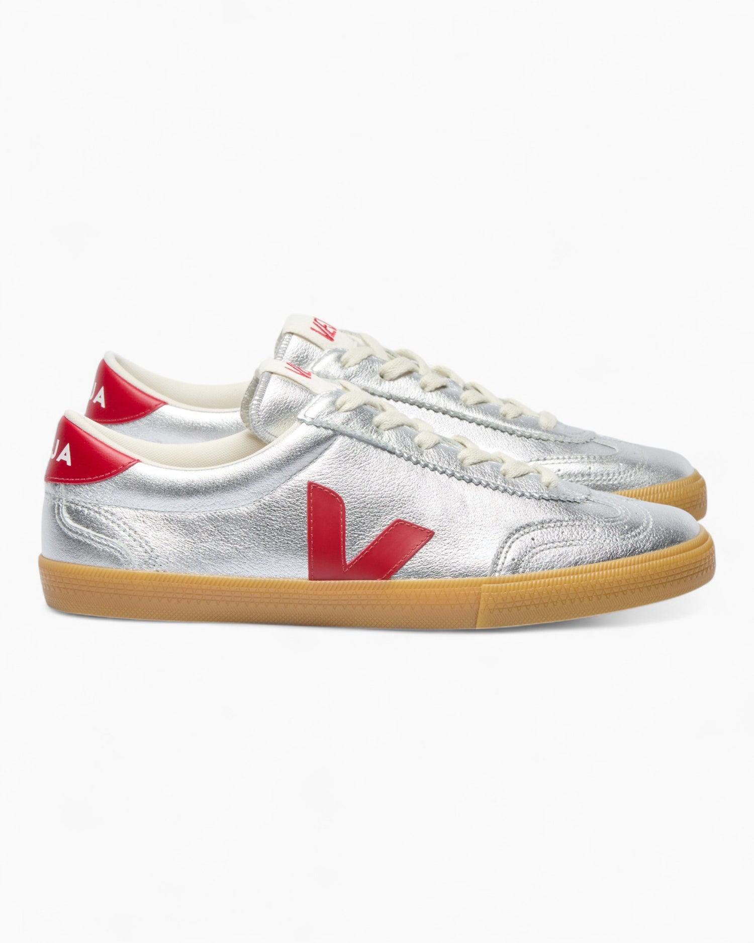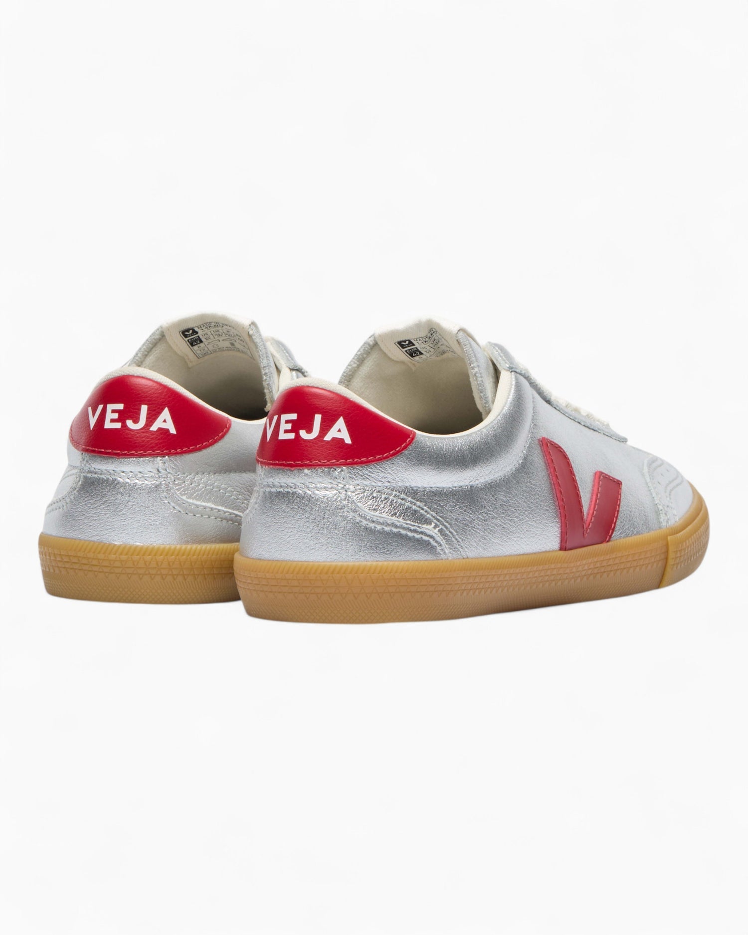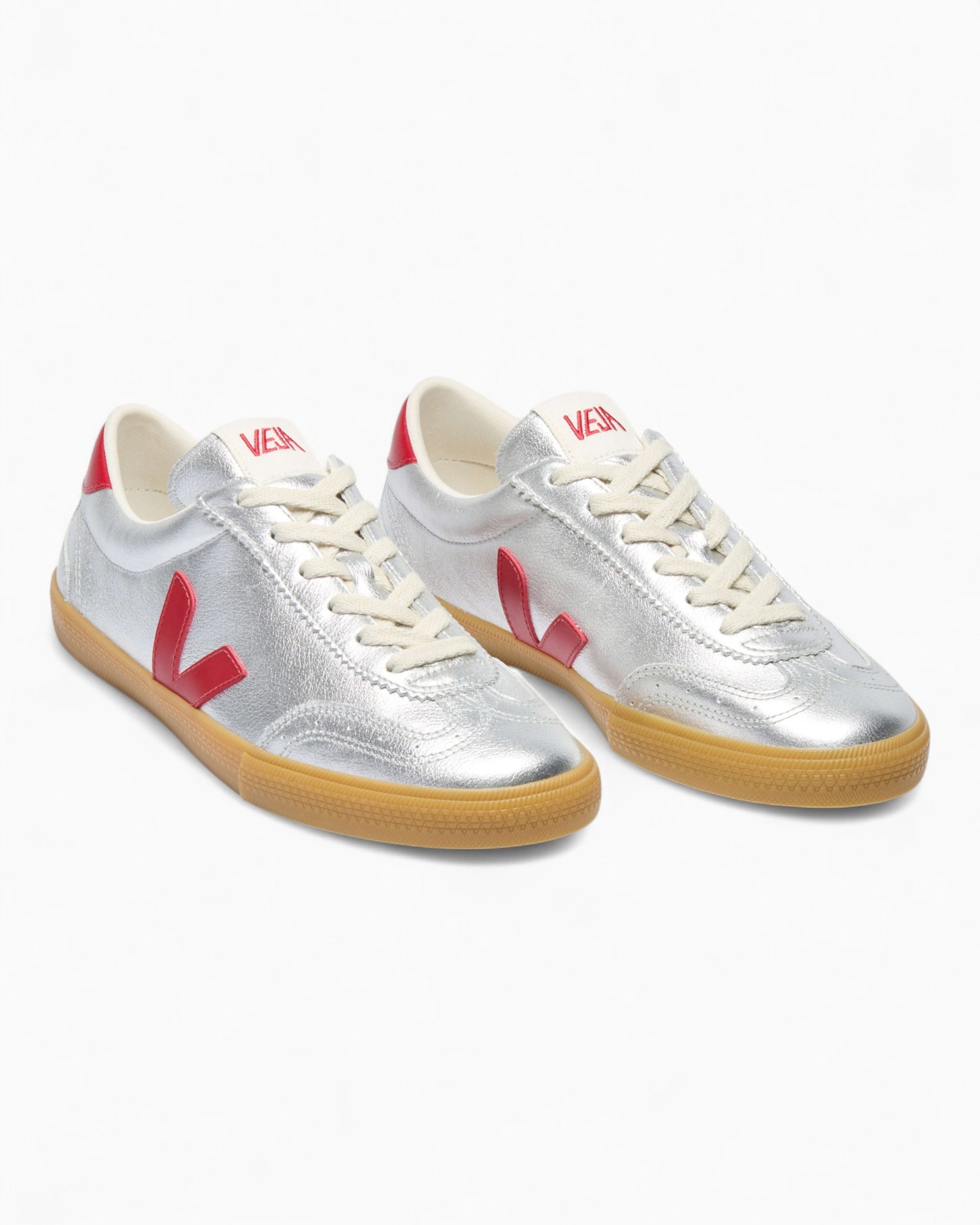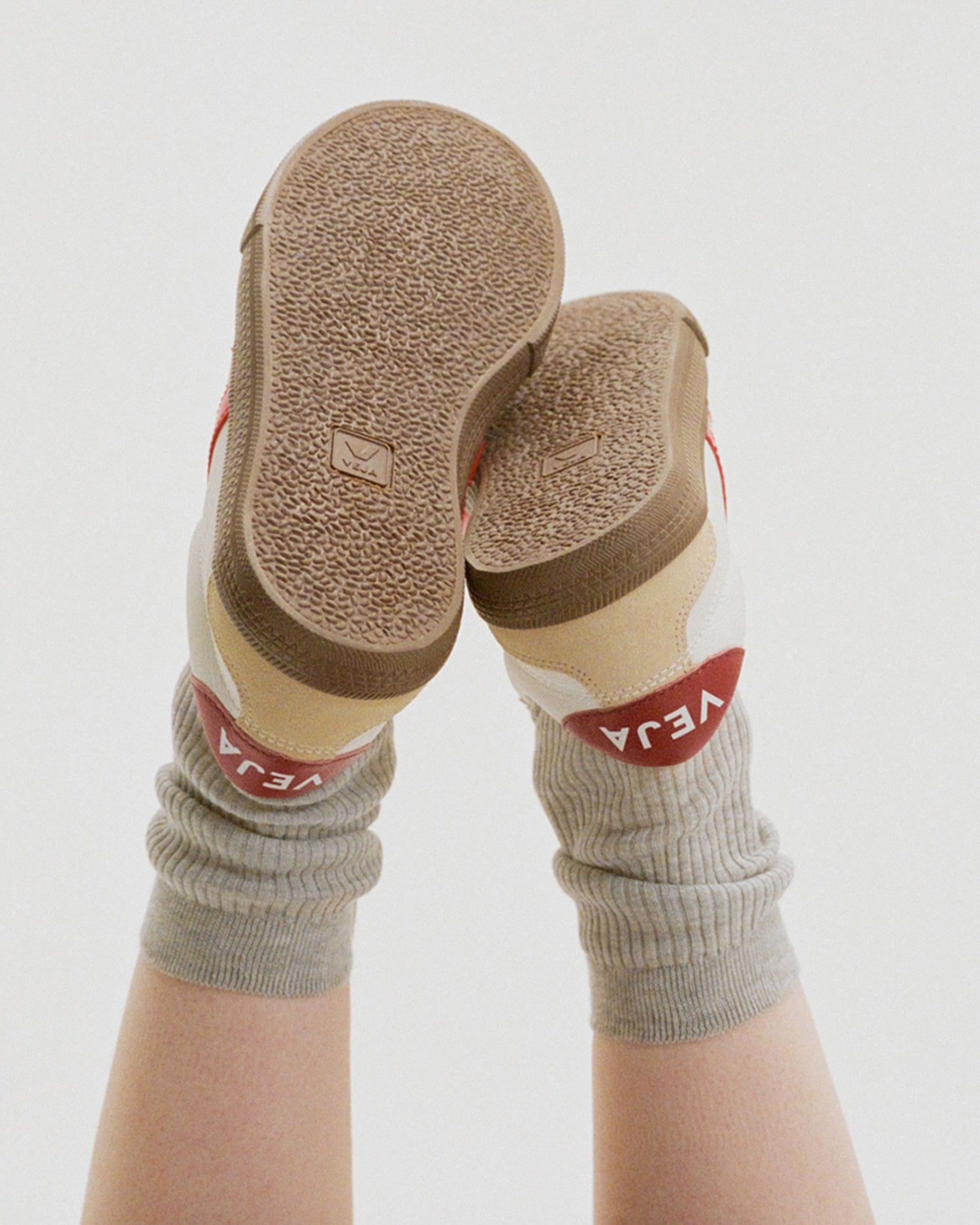 Volley is VEJA's first model, launched in 2005, inspired by the Brazilian volleyball shoes of the 70s. Volley Organic Traced Leather is produced with 100% certified organic leather from farms in Uruguay. The leather undergoes a mechanical beating process that makes it thin and pliable. The logo on the tongue of the sneaker is VEJA's first logo.
