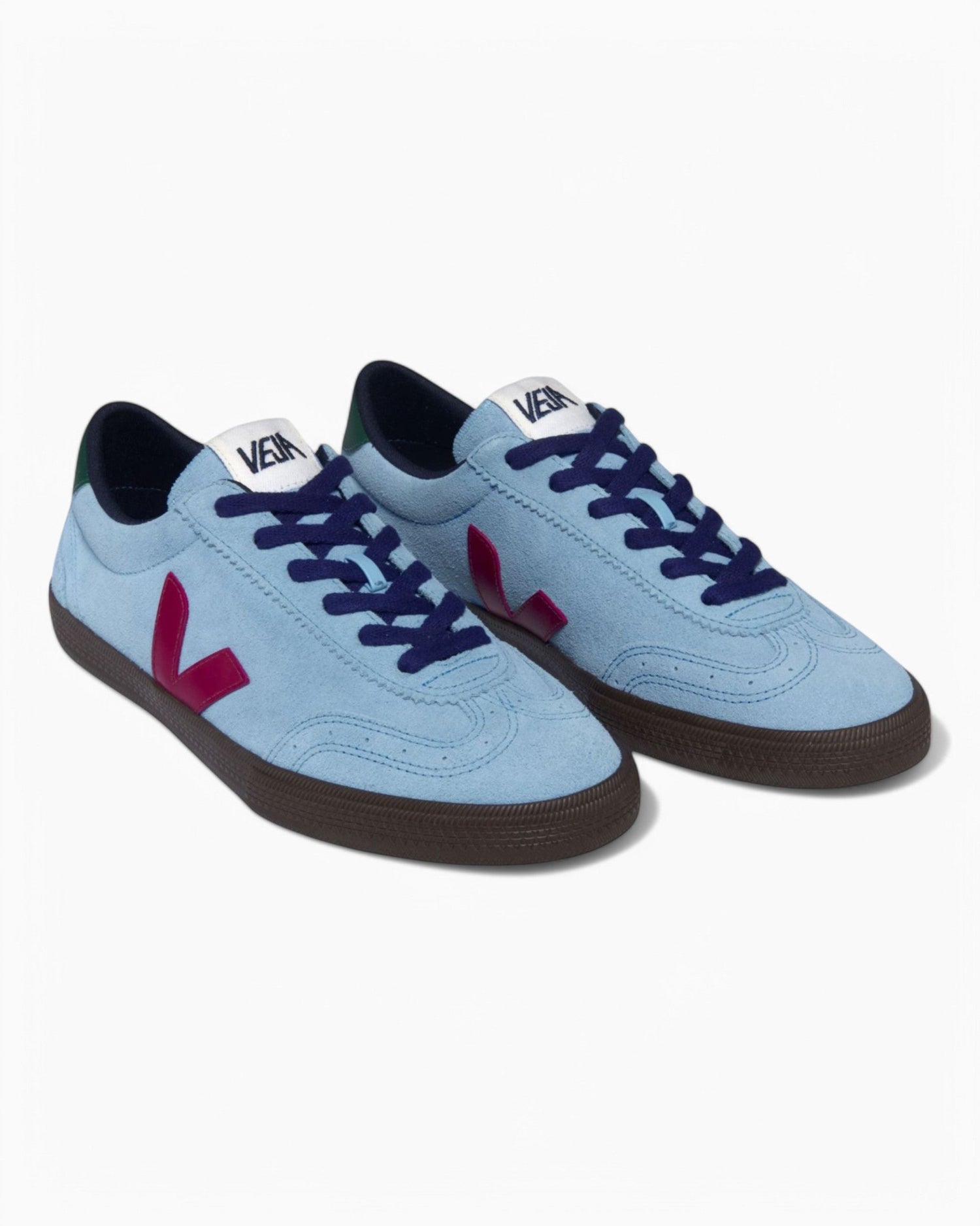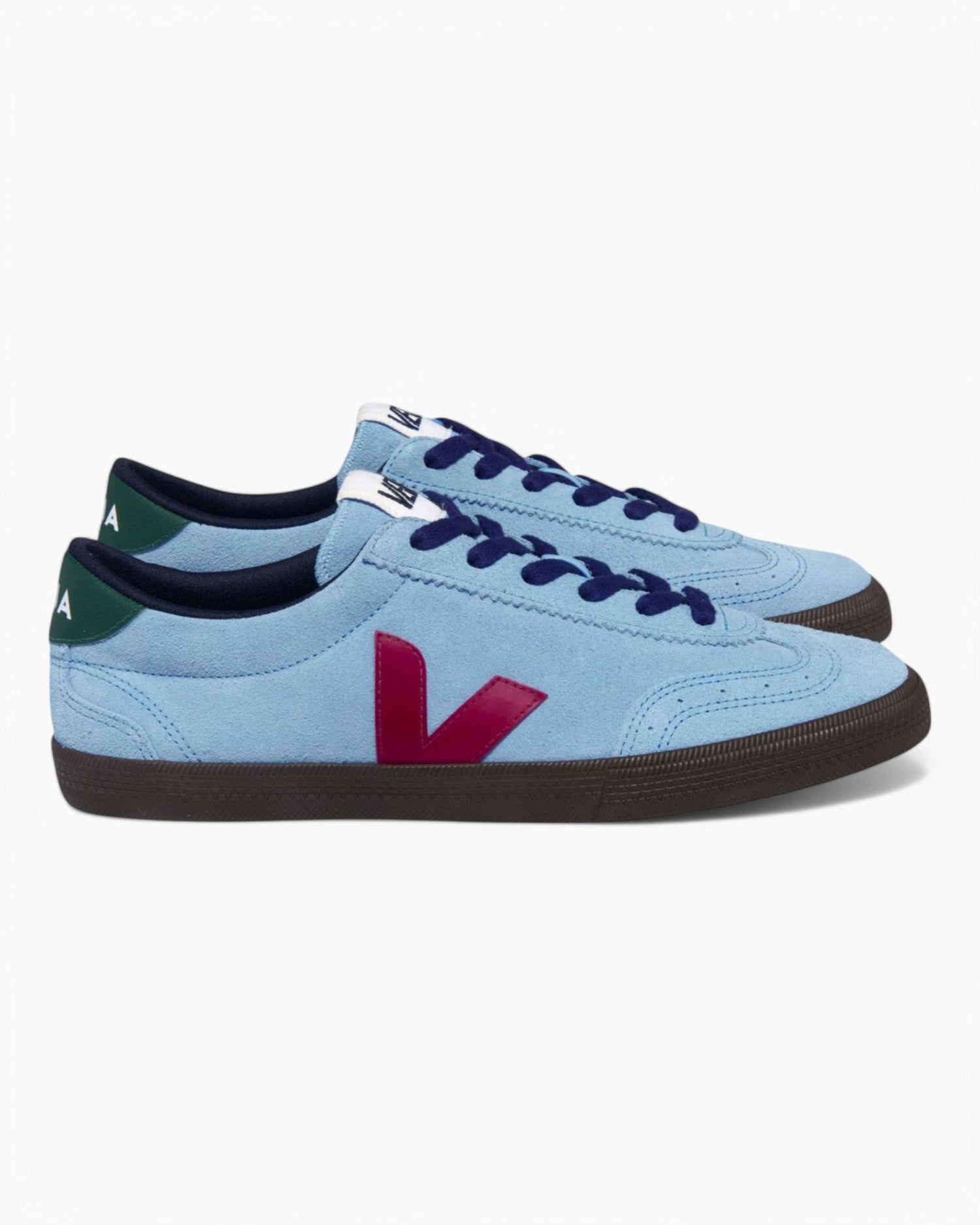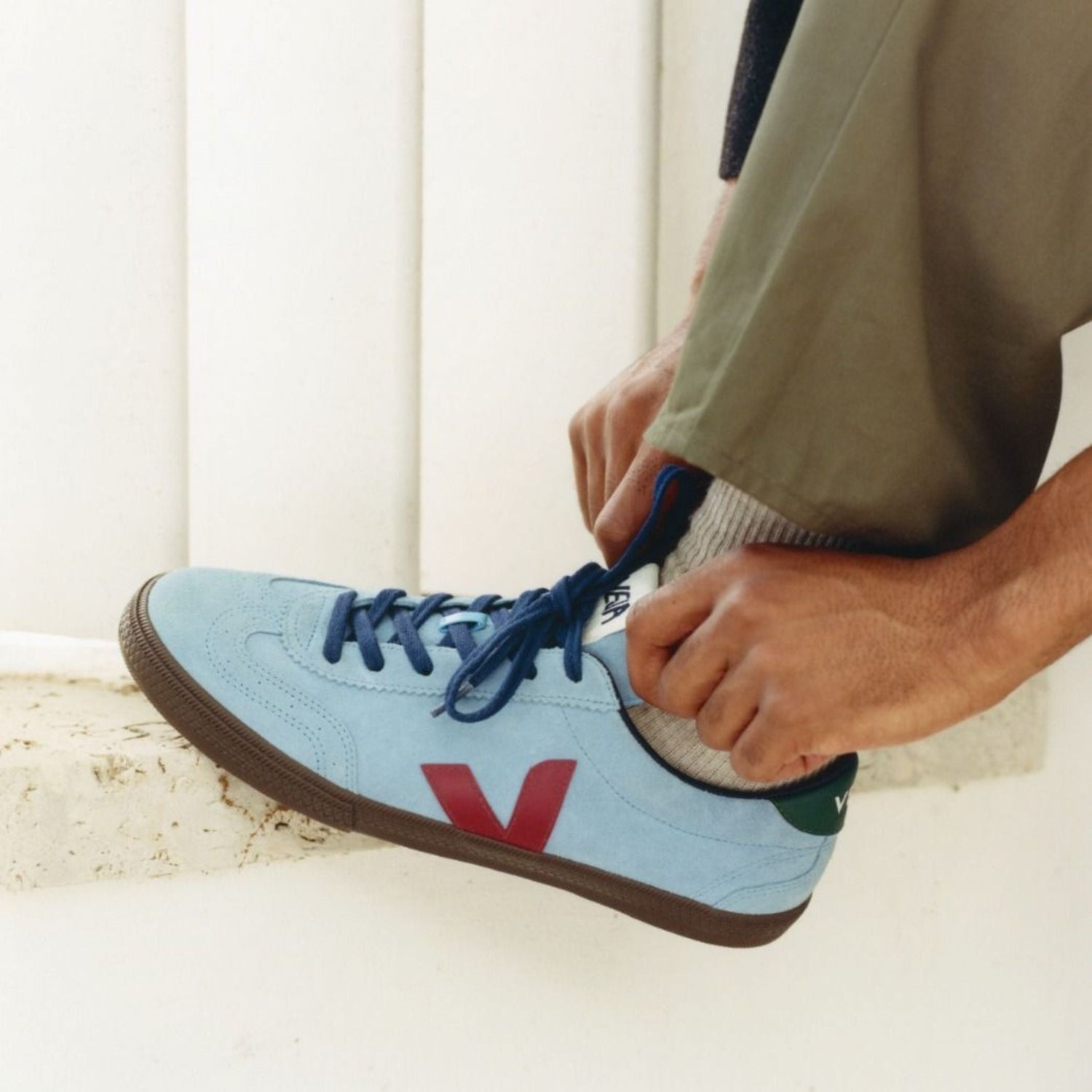 Volley is VEJA's first model, launched in 2005, inspired by the Brazilian volleyball shoes of the 70s. Volley Suede is made from the underside of brushed cowhide from farms in the south of Brazil to make it softer and more flexible. Particular attention is paid to the use of water during the tanning process. To additionally protect the sneaker from light rain, the suede is coated with waterproof oils that do not contain PFCs (chemical compounds). The logo on the tongue of the sneaker is VEJA's first logo.