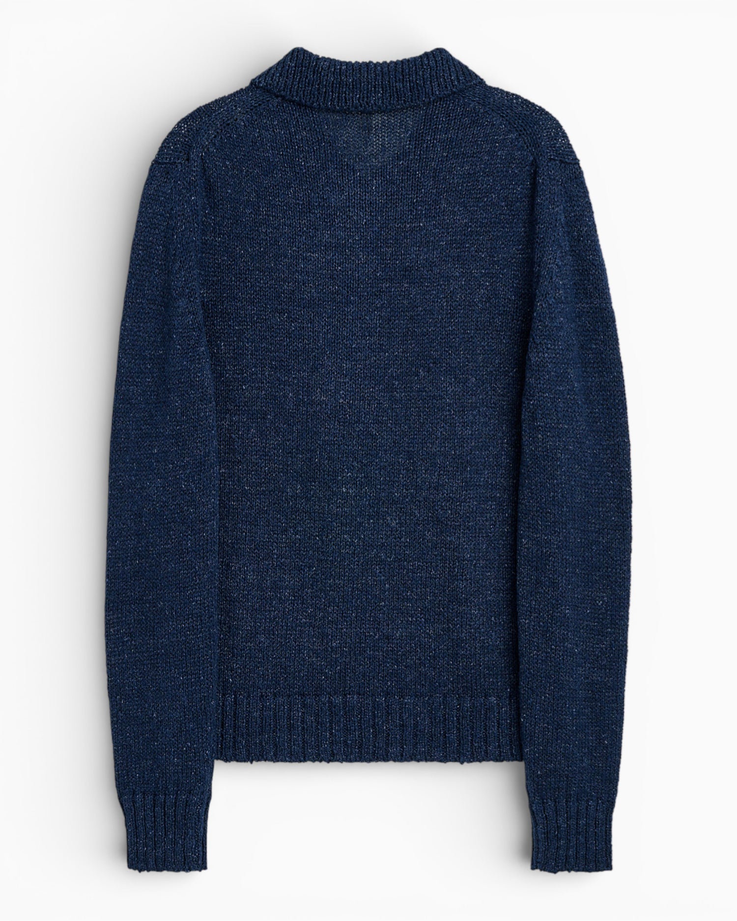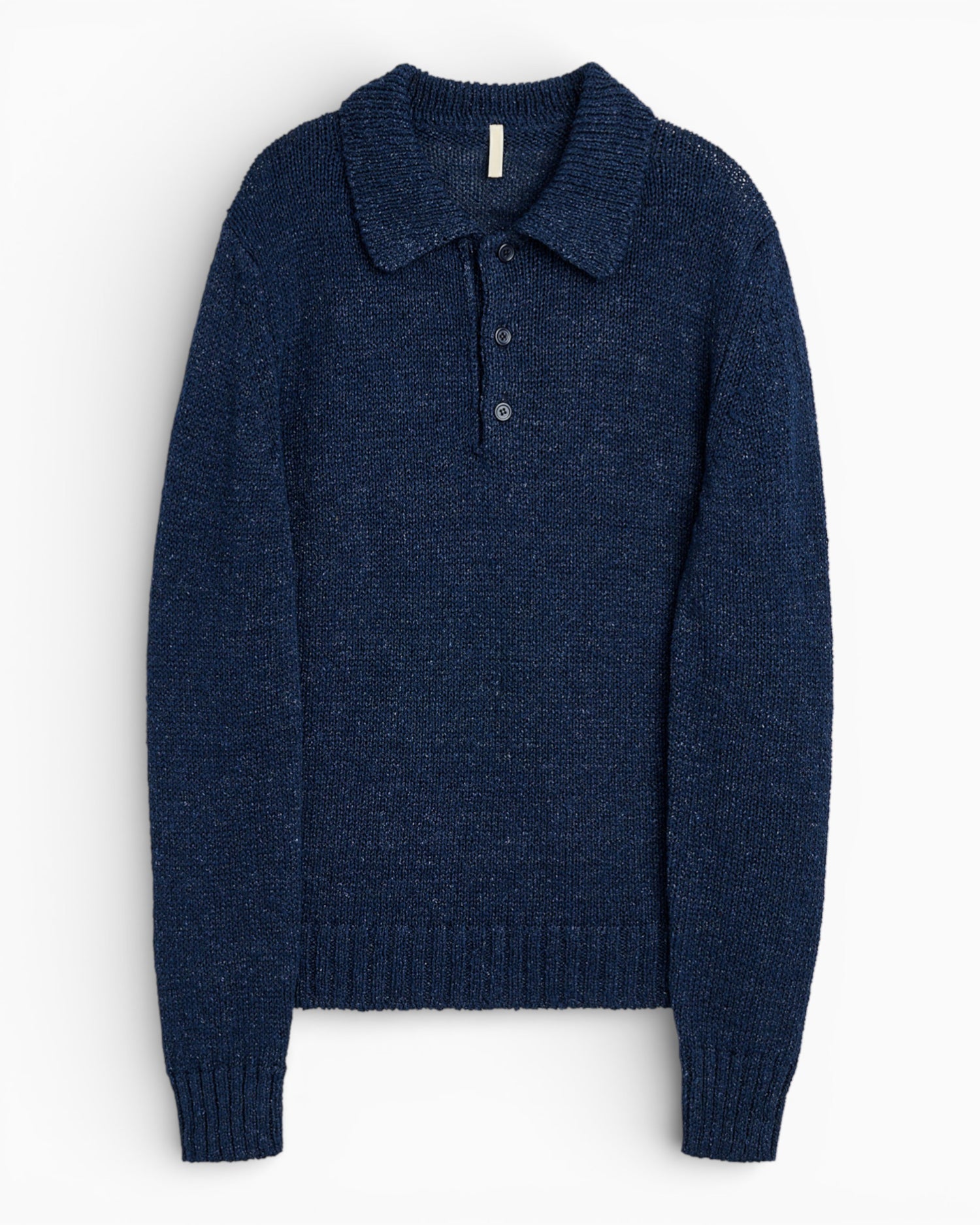 Knitted from premium linen yarn in a 7gg gauge, it offers a natural texture, airy feel, and relaxed elegance. Finished with a classic polo collar and corozo buttons for a timeless, understated look.