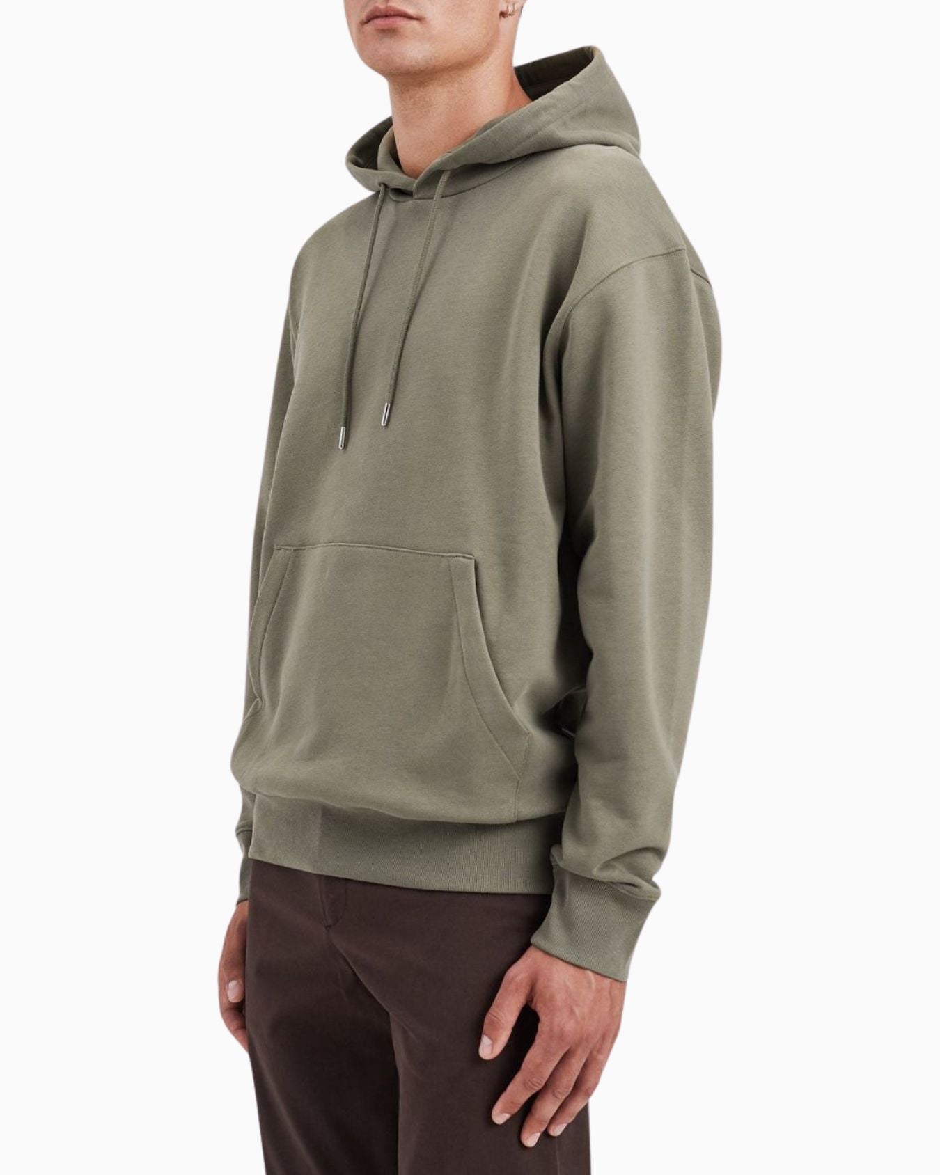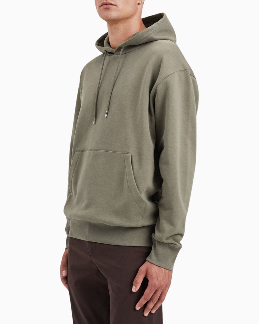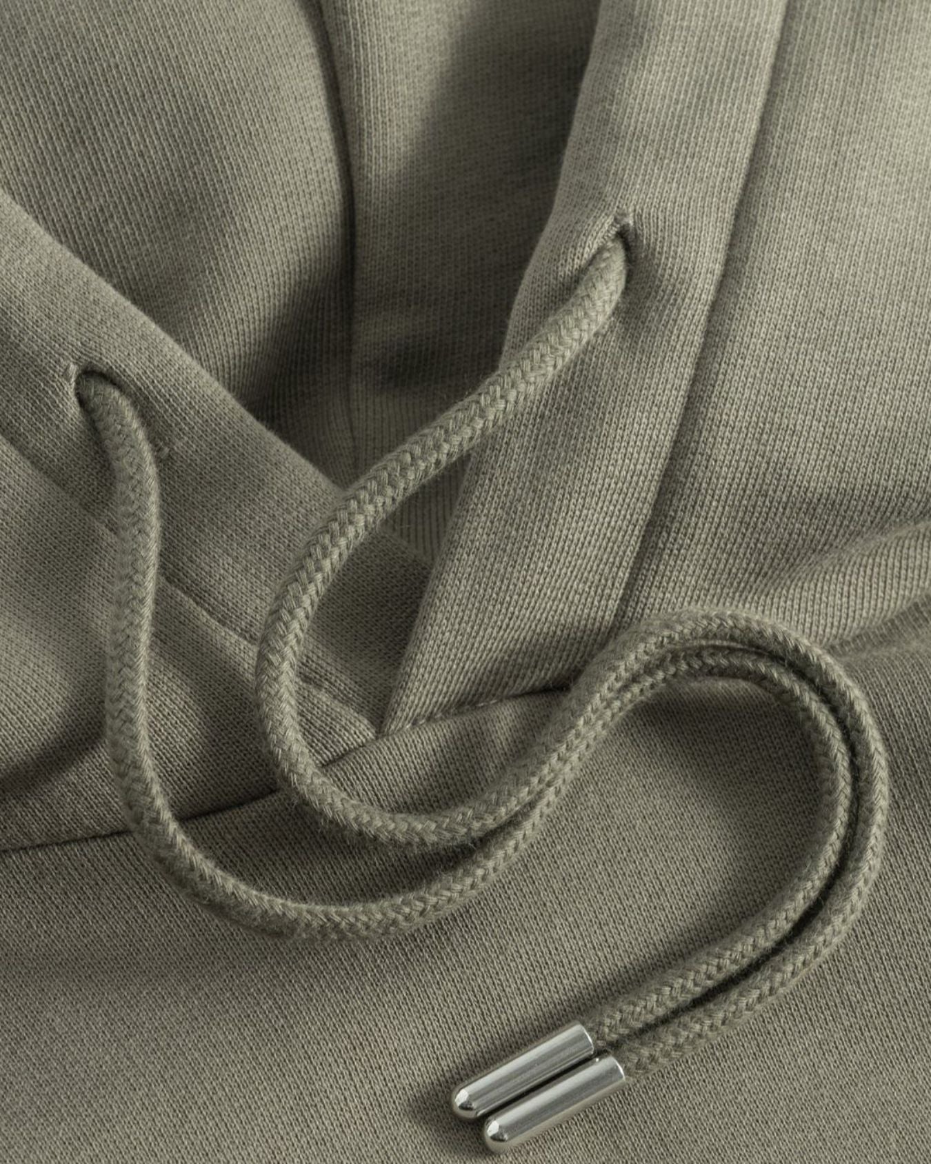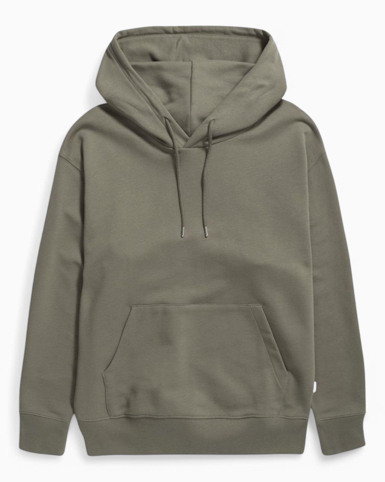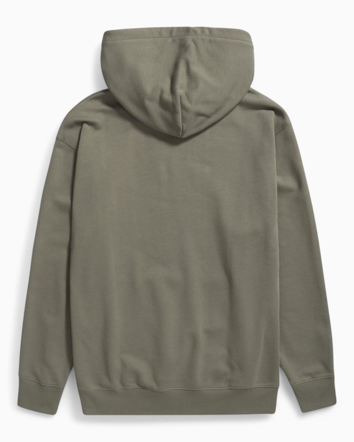 The Norse Standard Hoodie is made from midweight organic cotton, offering a regular fit. Crafted in Portugal, it features set-in sleeves, a loopback sweat finish, an adjustable double-layer drawstring hood with metal aglets, a kangaroo pocket, and ribbed cuffs and hem.