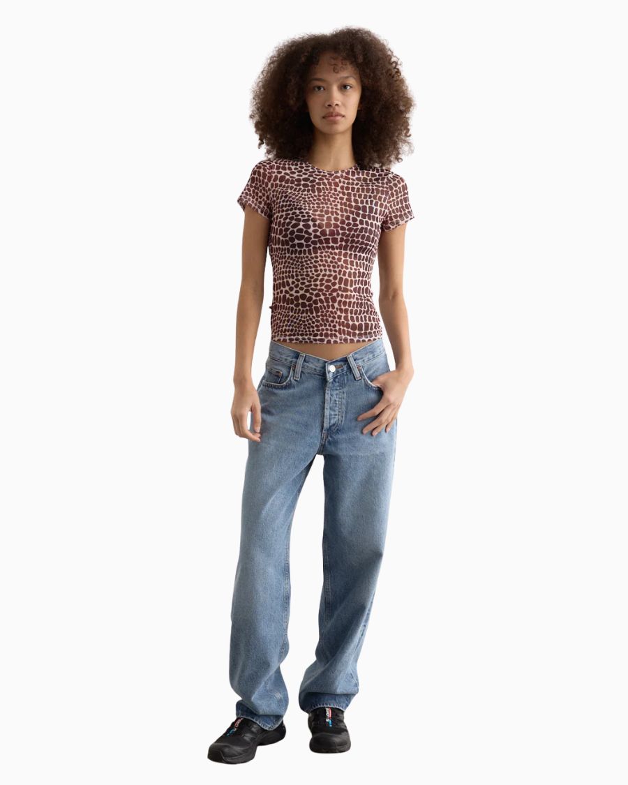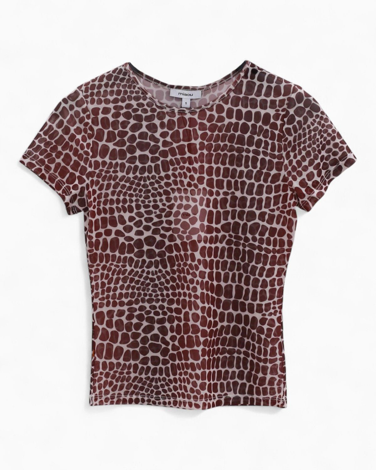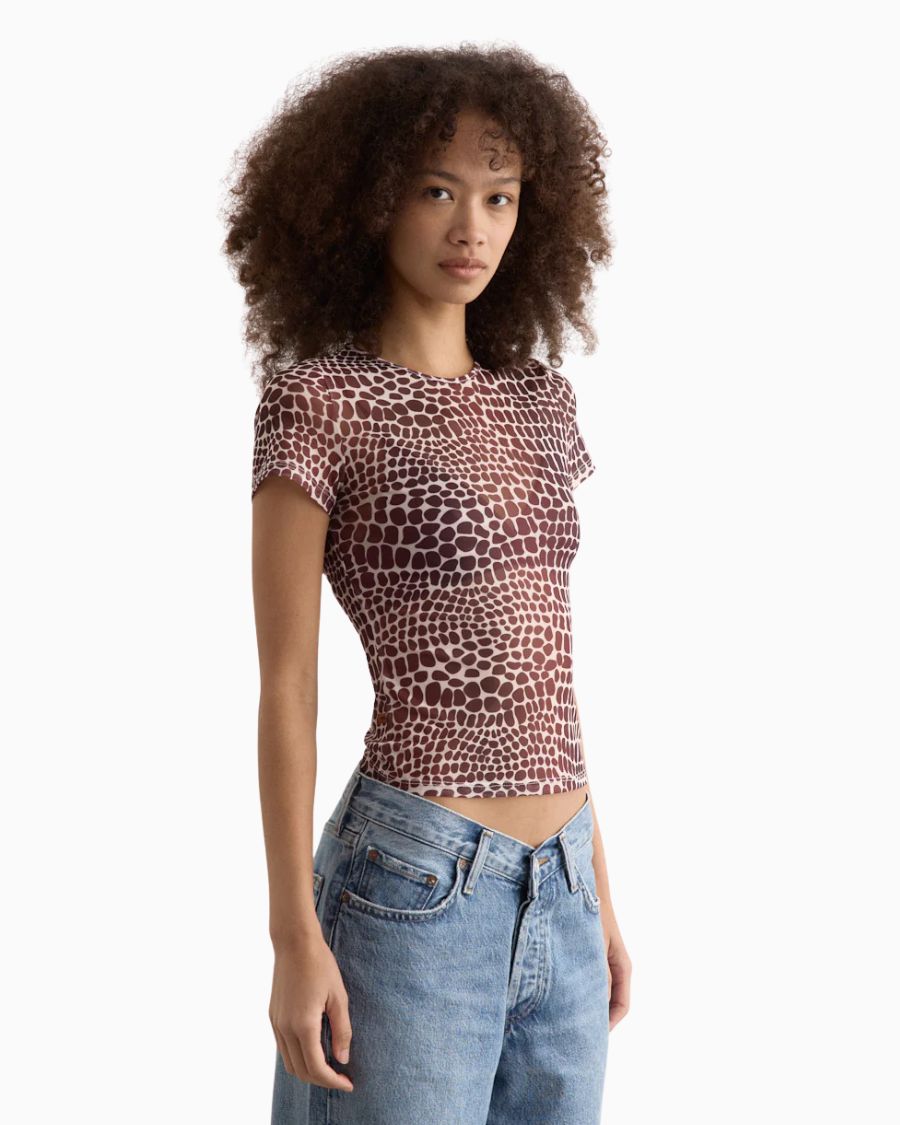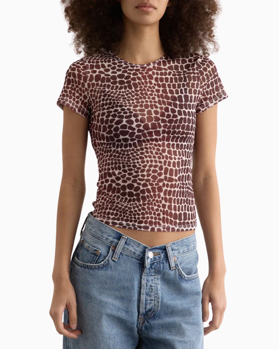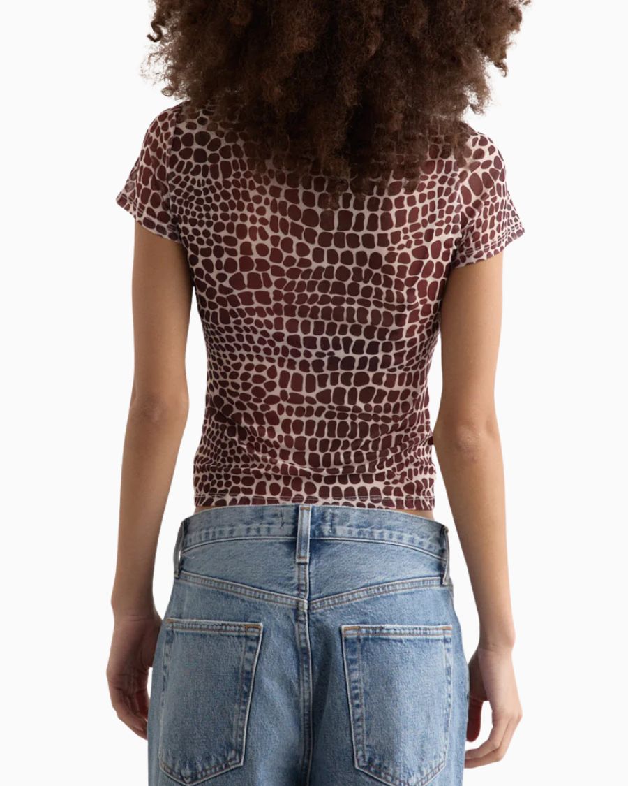 Blending vintage aesthetics with modern edge, the Mini Tee offers a sleek silhouette in a slim-fit cut that subtly hugs the body. Its cropped length creates a striking contrast when paired with low-rise jeans or high-waisted pants. The sheer panel adds a daring yet refined touch of skin for an effortlessly confident look.