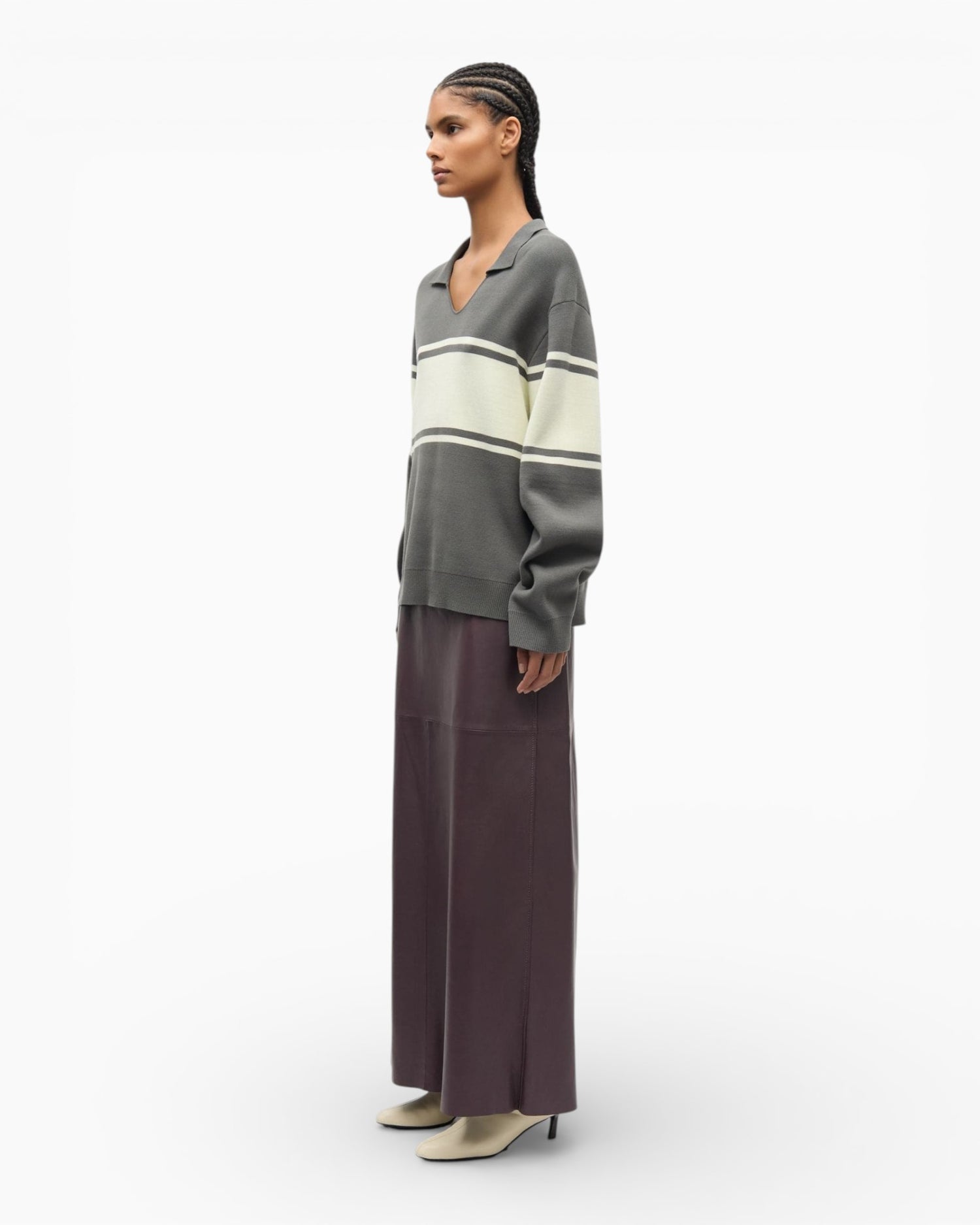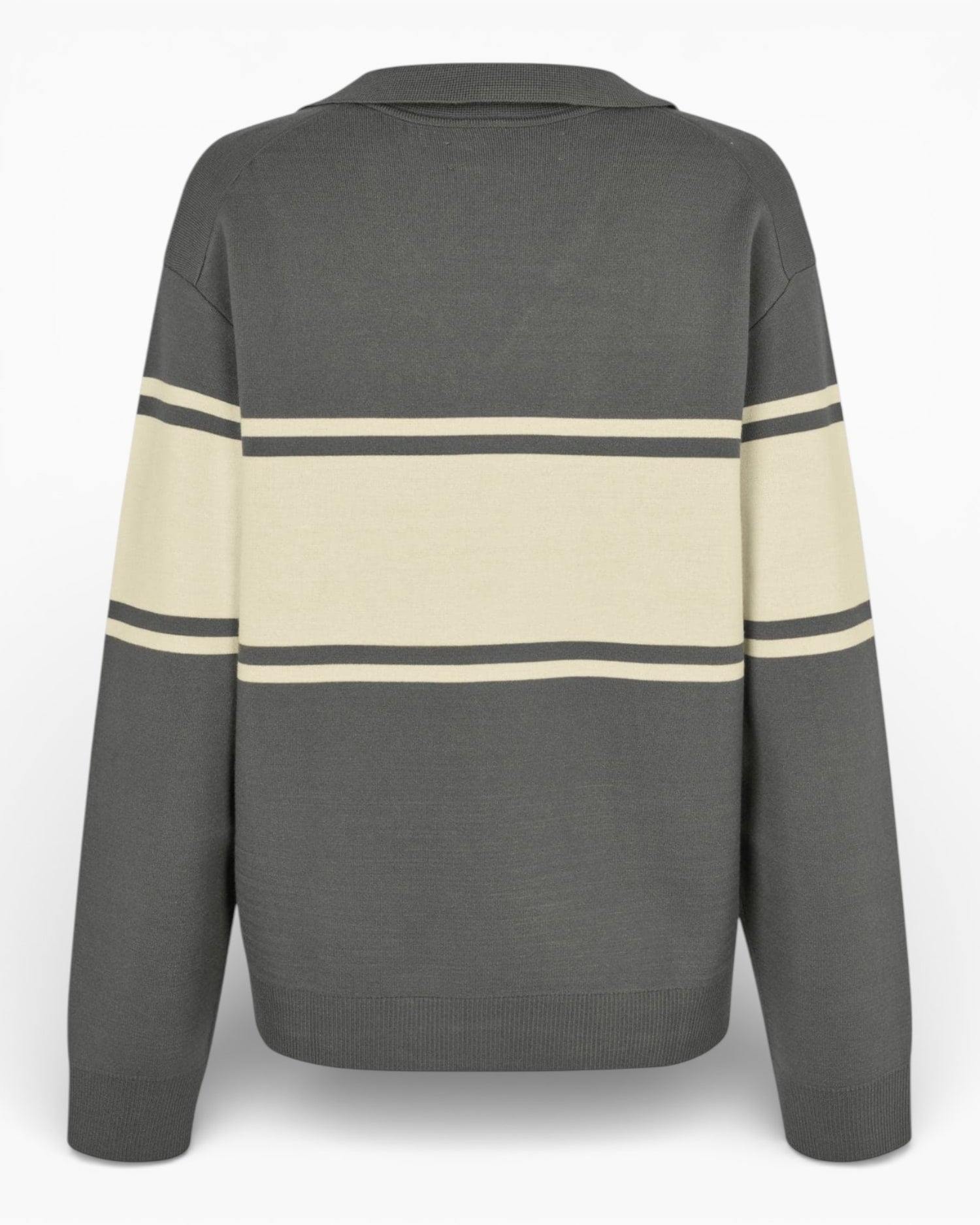 A refined knit designed for everyday ease, this striped sweater features a regular fit with dropped shoulders for a relaxed, modern silhouette. The polo collar and V-neck detail add a structured touch, while rib-knitted cuffs and hem provide a clean finish. Its soft, elastic blend fabric ensures comfort and flexibility throughout the day.