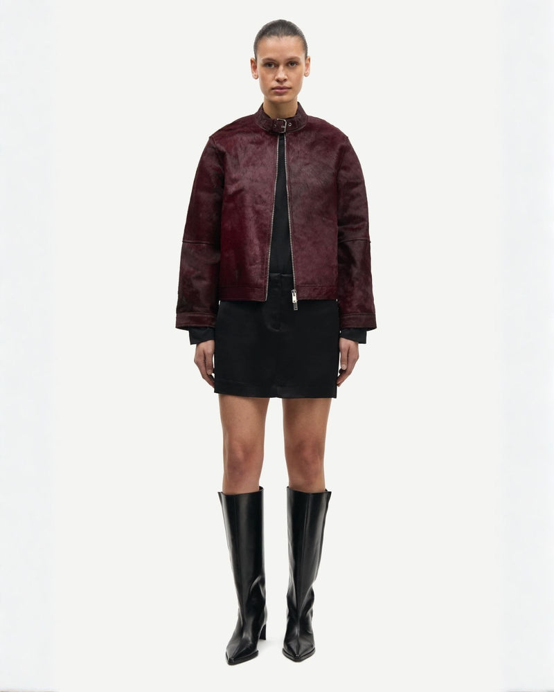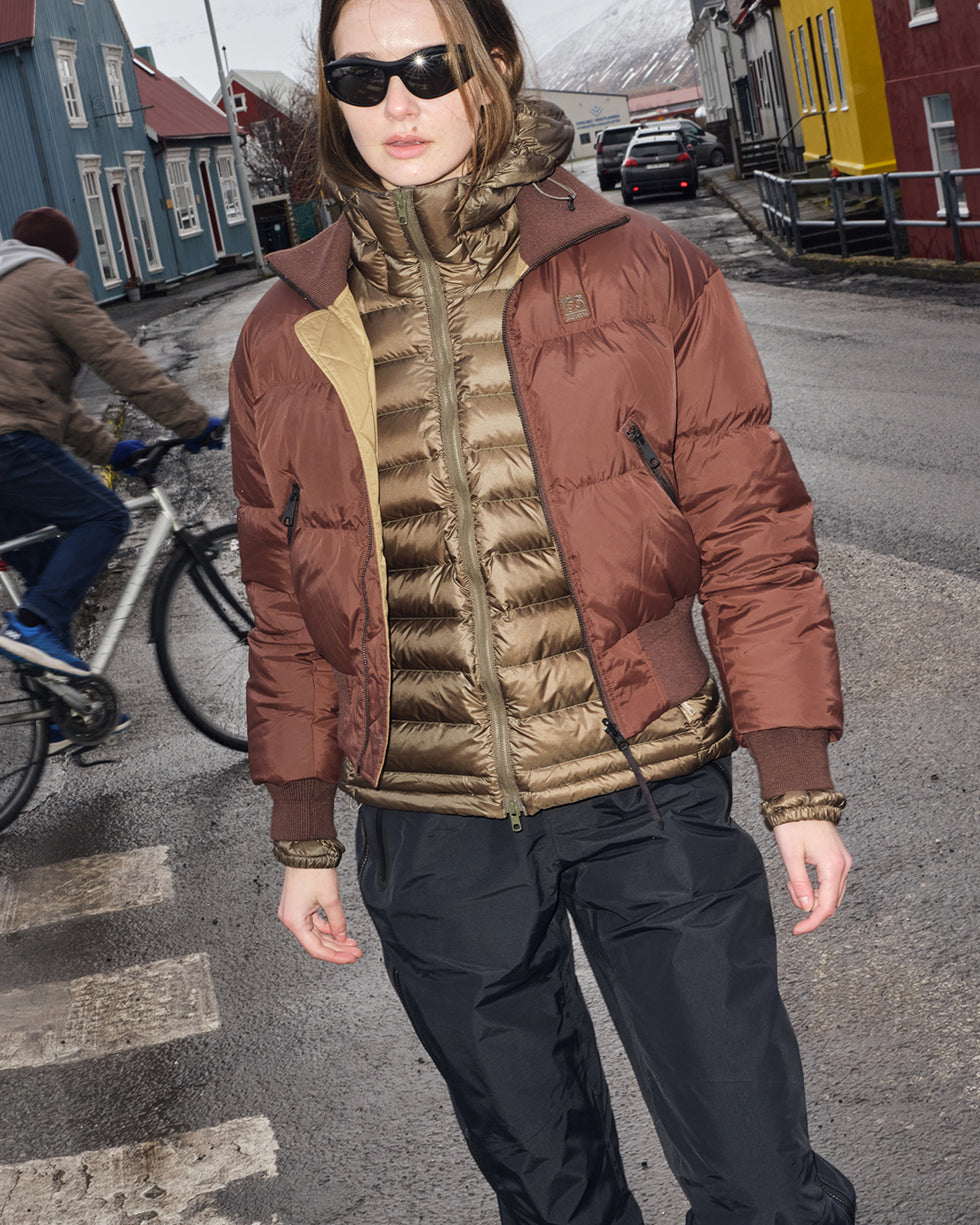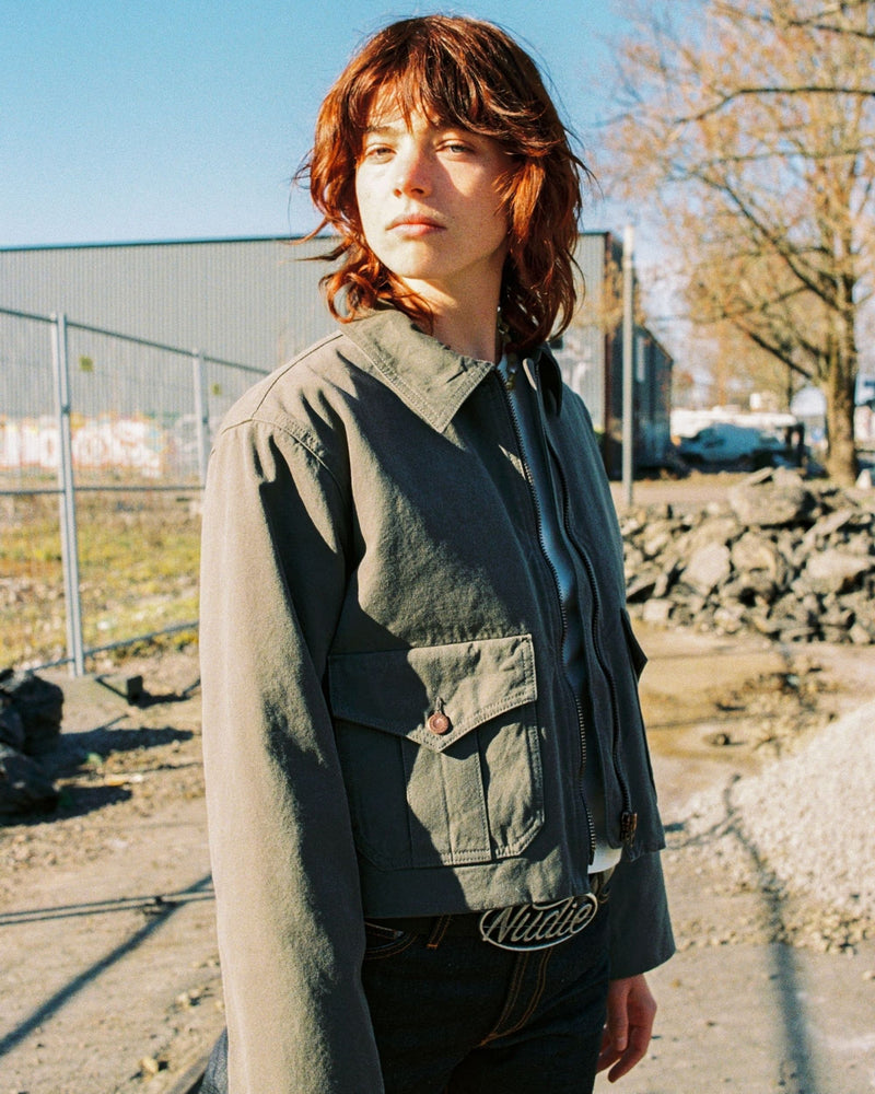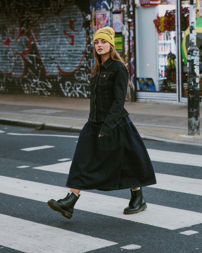 The Nudie Jeans Anna skirt is a timeless choice for those who can’t part with denim, thanks to its natural texture and modern cut. Layered with the Carhartt WIP Drewe jacket, the contrasting lines create a striking balance. One brings an urban ease, the other a functional street aesthetic — and together, they make a perfect match.