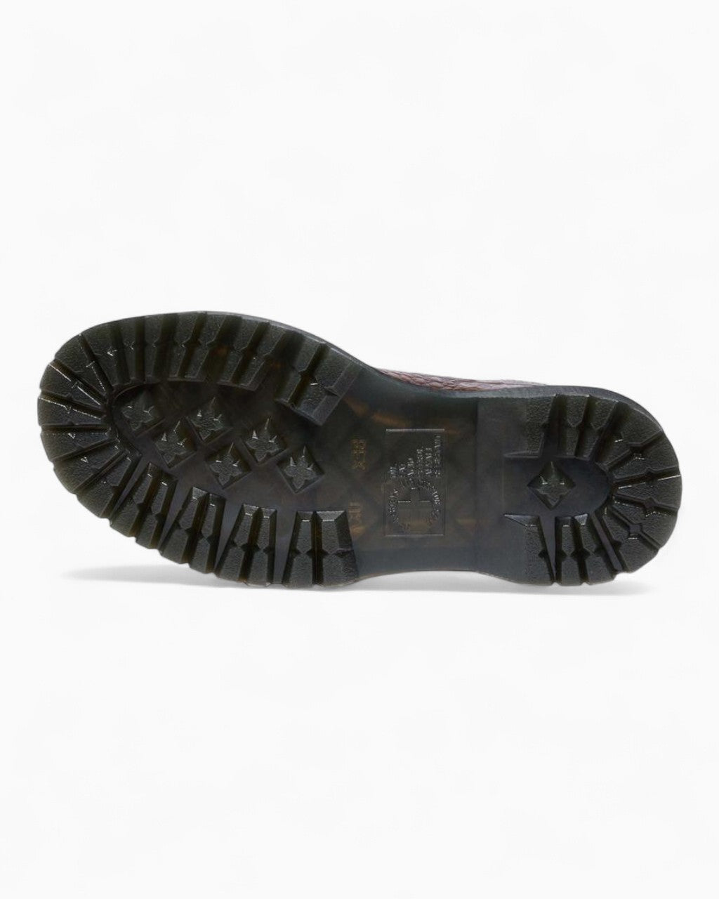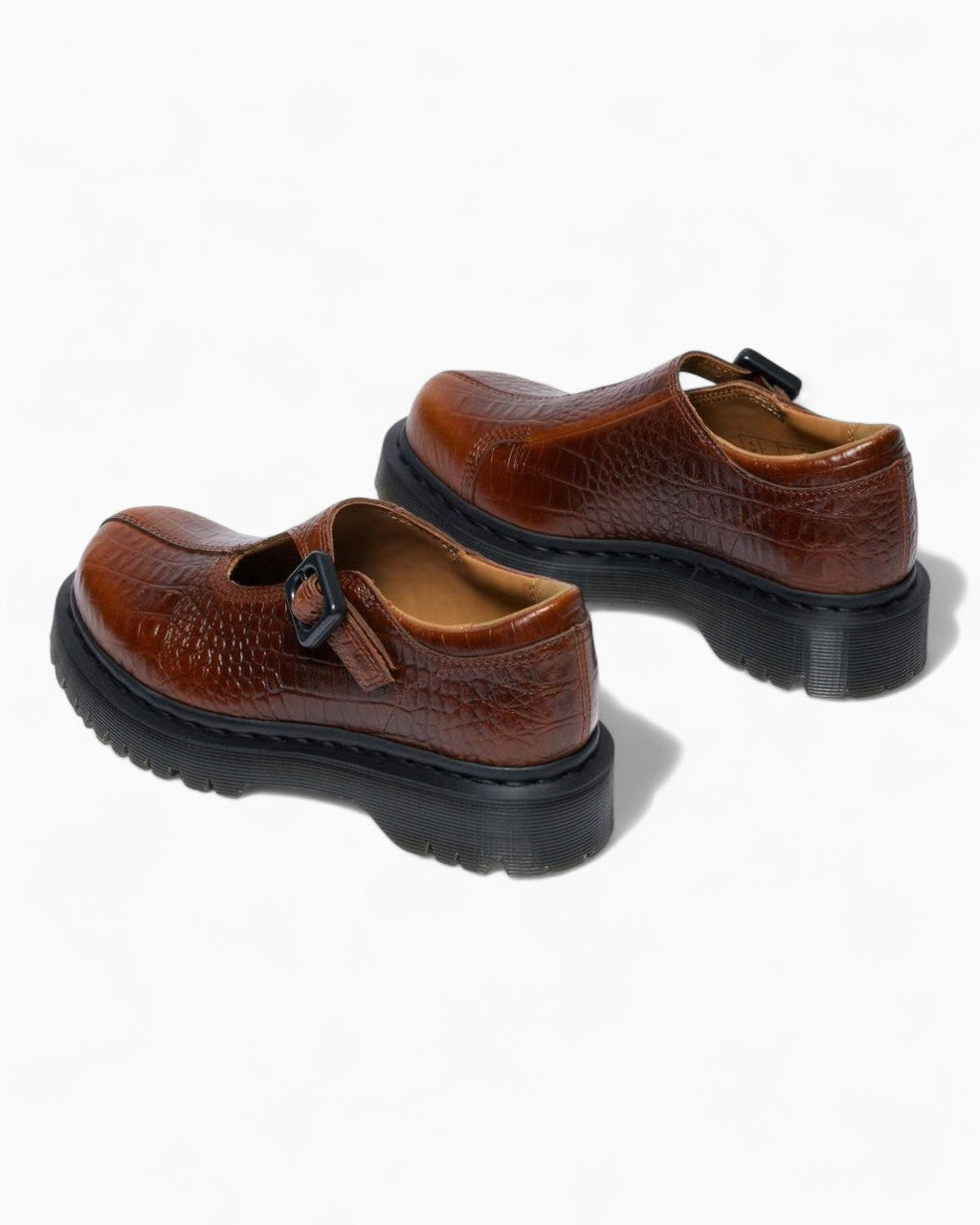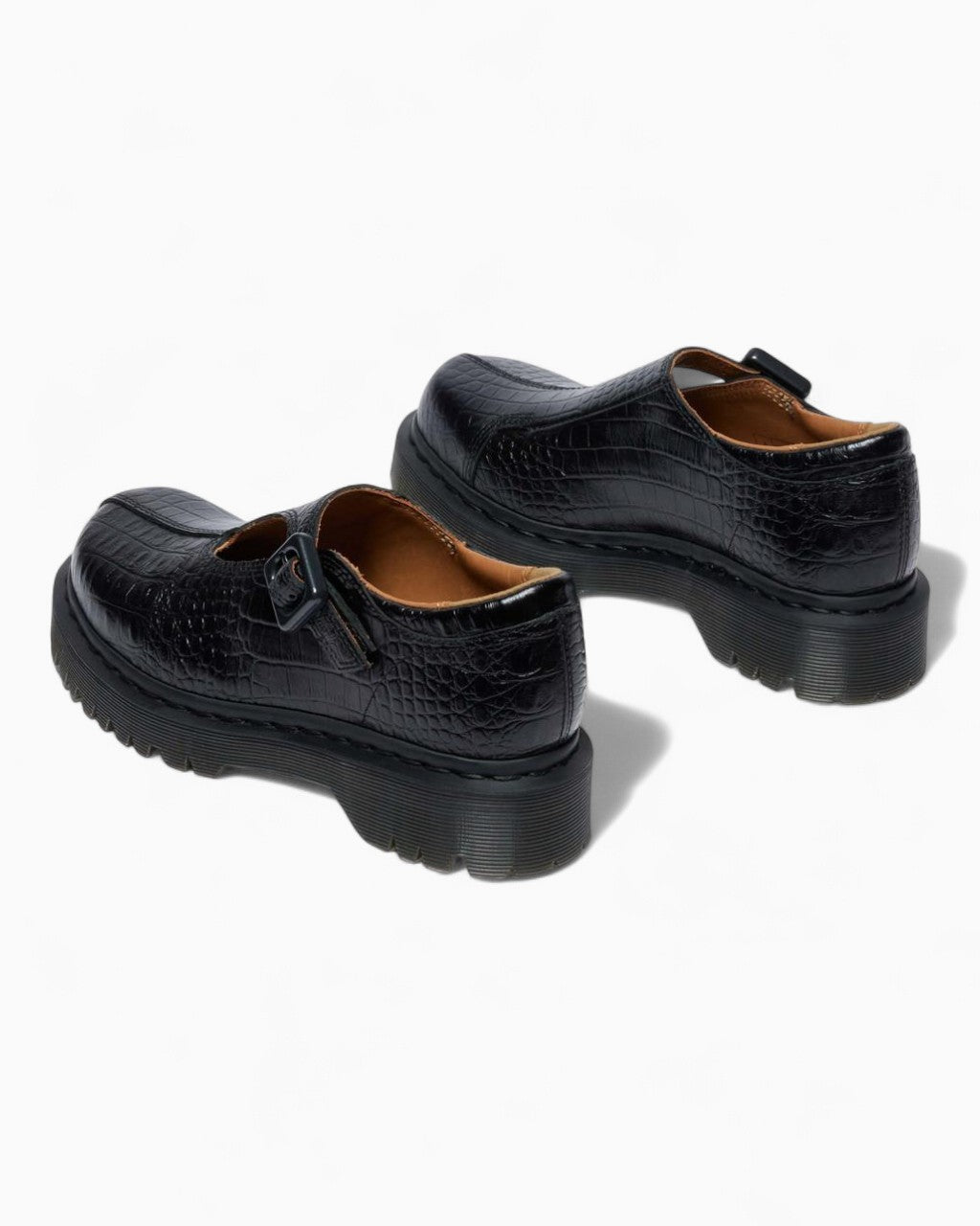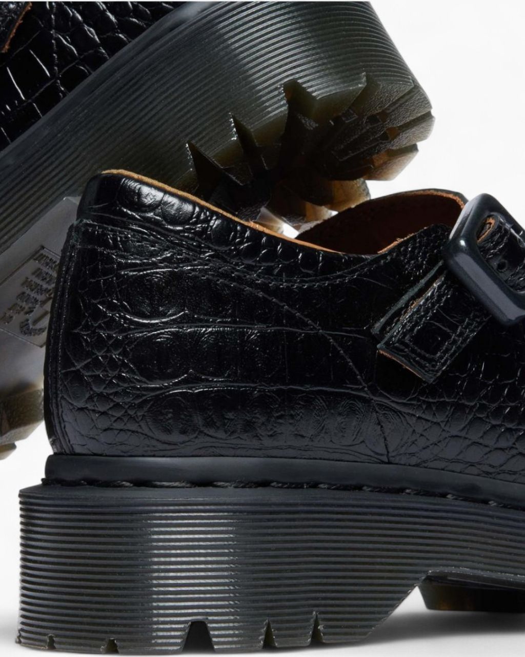 The Rejena Mary Jane passionately reimagines the classic silhouette with a bold, refined touch. Crafted from croc-embossed Analine leather, it stands out with its asymmetric cut, single buckle strap, and squared bump toe that redefine elegance. Completed with a smoke-grey Bex platform sole and signature black welt stitching, it retains the unmistakable Dr. Martens attitude.